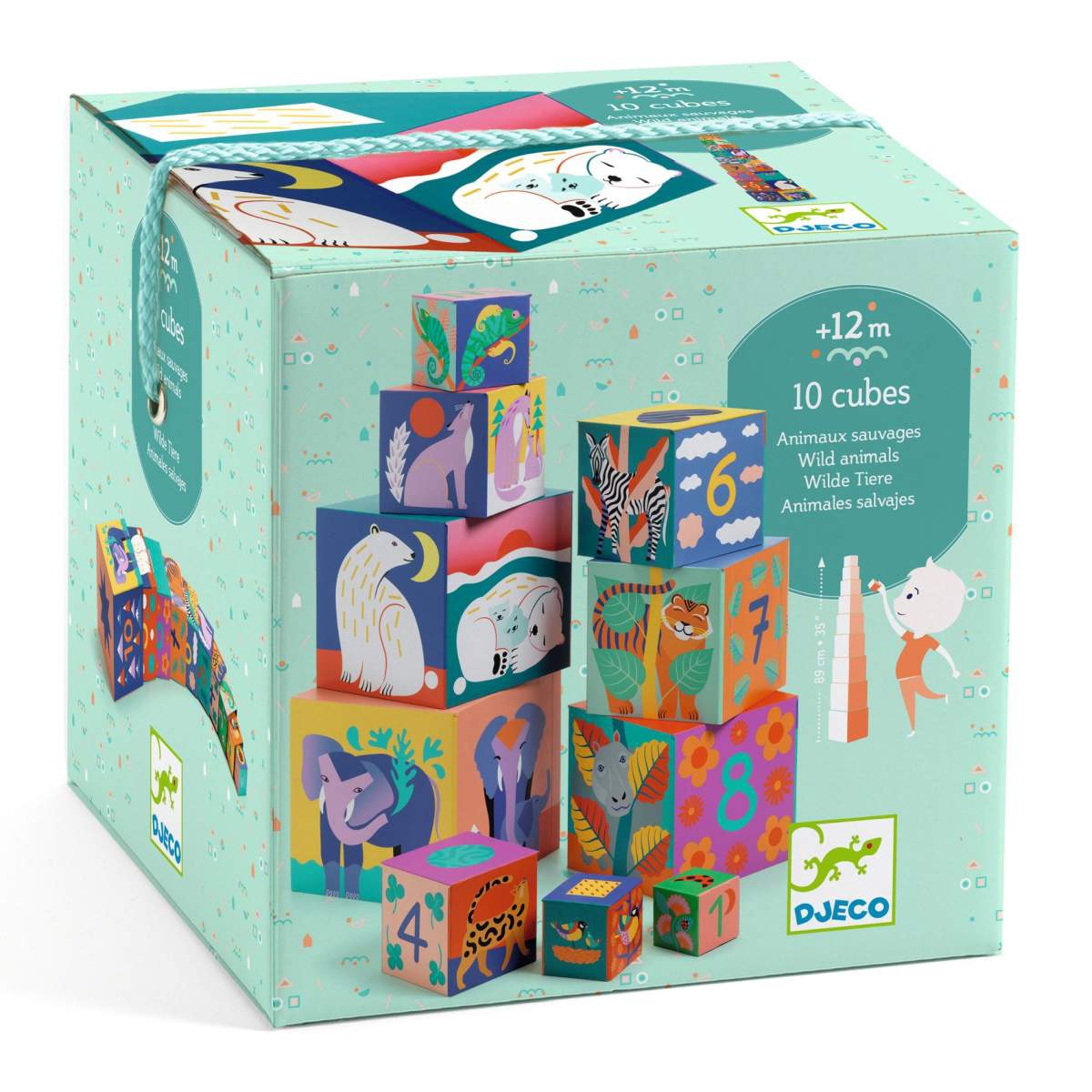 Der Stapelturm Wilde Tiere von Djeco besteht aus 10 Würfeln, die mit schönen farbenfrohen Motiven bedruckt und stapelbar sind. Die Würfel können sowohl aufeinander als auch ineinander gesteckt werden, da sie sich bezüglich ihrer Größe nach oben hin verjüngen. Jede Seite der Würfel präsentiert sich in einem anderen Design: mal Tiere, Tierbabys, Pflanzen oder ein Baum, der sich durch alle 10 Würfel zieht. Sogar erstes Zählen kann hier geübt werden. Ein wahrlich hübsch gestaltetes Stapelspiel für Kinderhände!