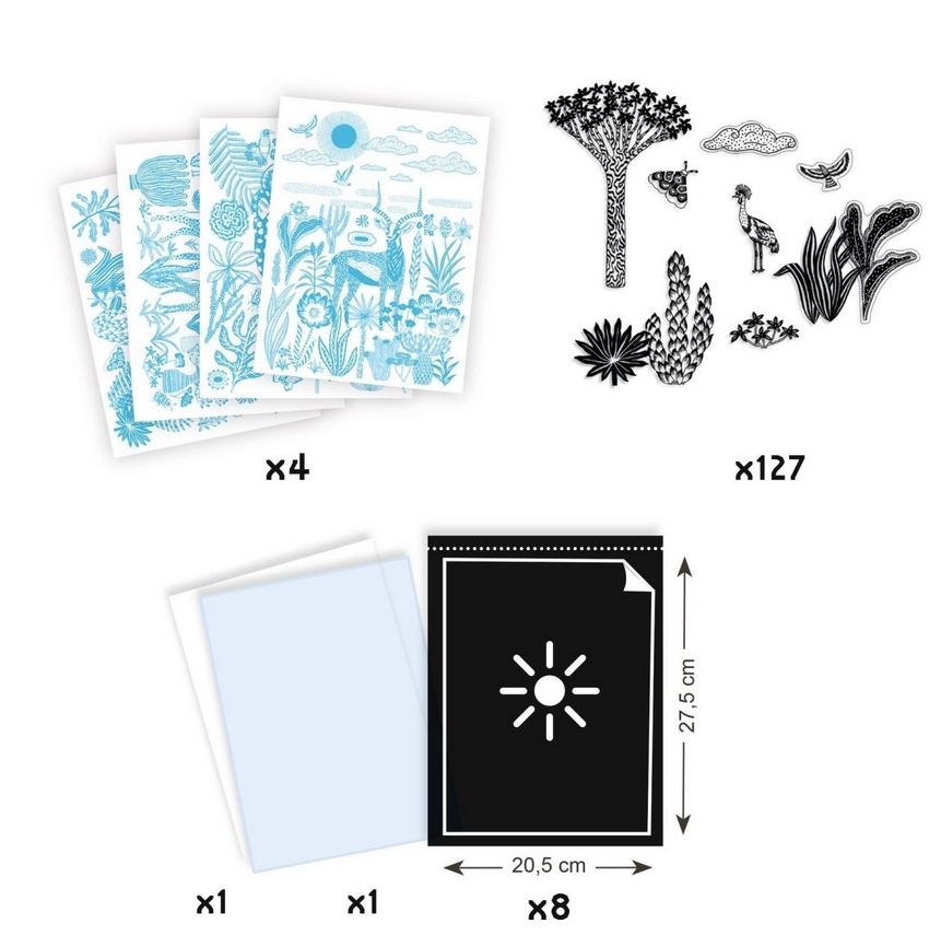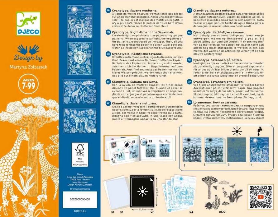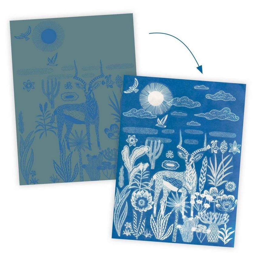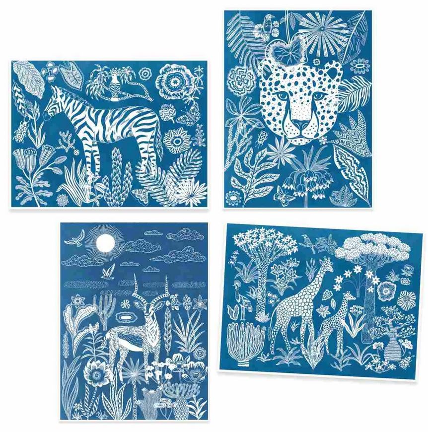Workshop Blaudruck Savanne bei Nacht von Djeco ist wunderschöne, poetische Kreativität mit Sonnenlicht: Schablonen werden auf Lichtempfindliches Papier ("Blaupause") ins Sonnenlicht gelegt, dann ins Wasser gelegt und schon entstehen auf dem Papier die Silhouetten der Schablonen. Die Motive werden frei kombiniert und anschließend in einer der 4 schönen Motiv-Rahmen gesetzt: ein wunderschönes, individuelles Kunstwerk ist entstanden!