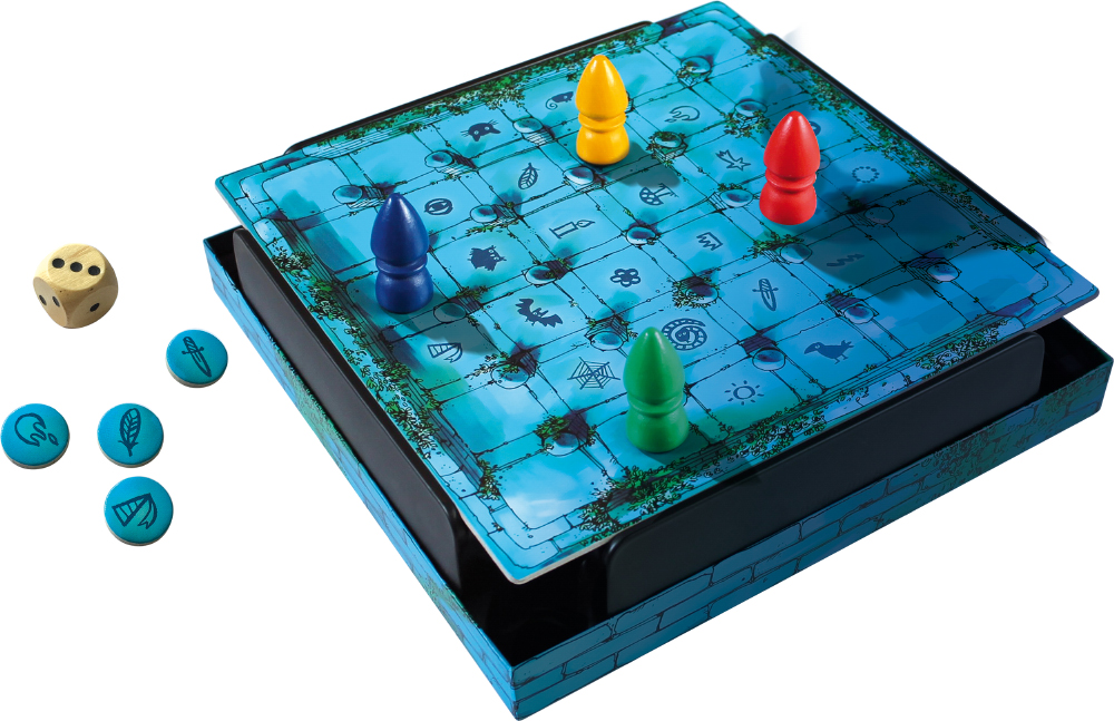 • Inhalt: Mehrschichtiges Spielfeld bestehend aus einem unterirdischen Labyrinth und der Bodenplatte, 24 Mauerteile aus Holz, 24 Chips mit magischen Symbolen, 1 Stoffbeutel, 1 Würfel, 4 magnetische Magier, 4 Metallkugeln, Spielanleitung