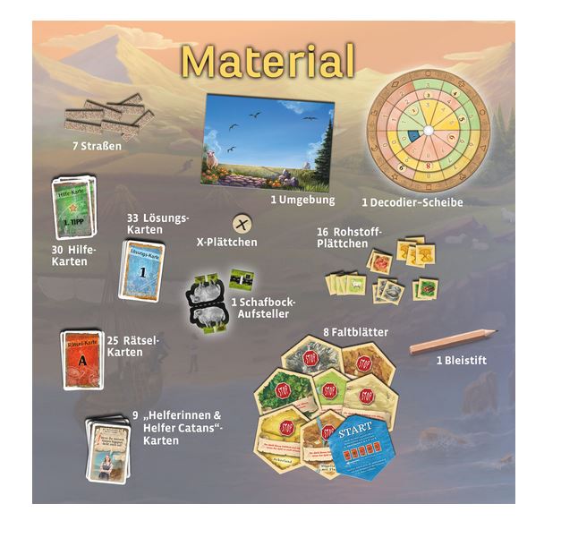 • Inhalt: 99 Karten, 1 Decodier-Scheibe, 8 Faltblätter, 12 seltsame Teile, 16 Rohstoff-Plättchen, 1 Anleitung