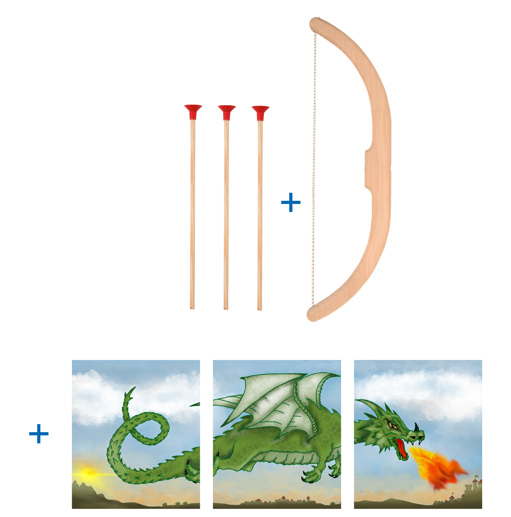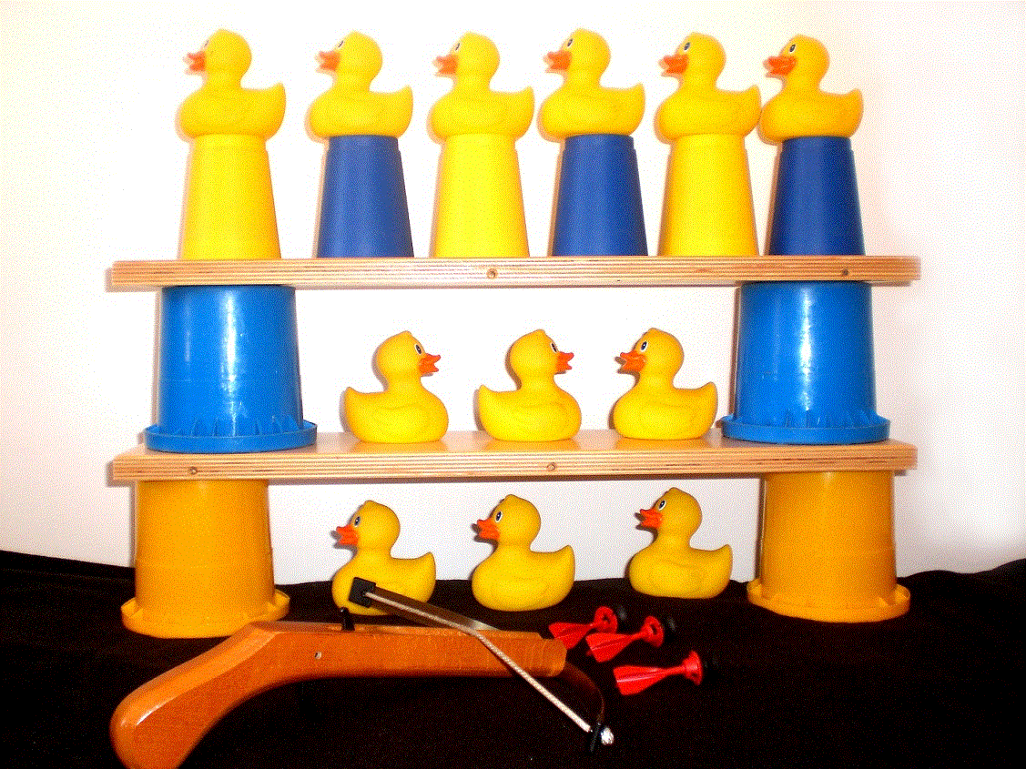 In der Kiste befinden sich 2 Armbrüste, 1 Spielbogen, ausreichend Pfeile, viele Gummienten, eine größere Zielscheibe zum Aufhängen, kleinere Zielscheiben zum Aufstellen, einiges nützliches Zubehör und eine Anleitung mit 3 Spielvarianten.