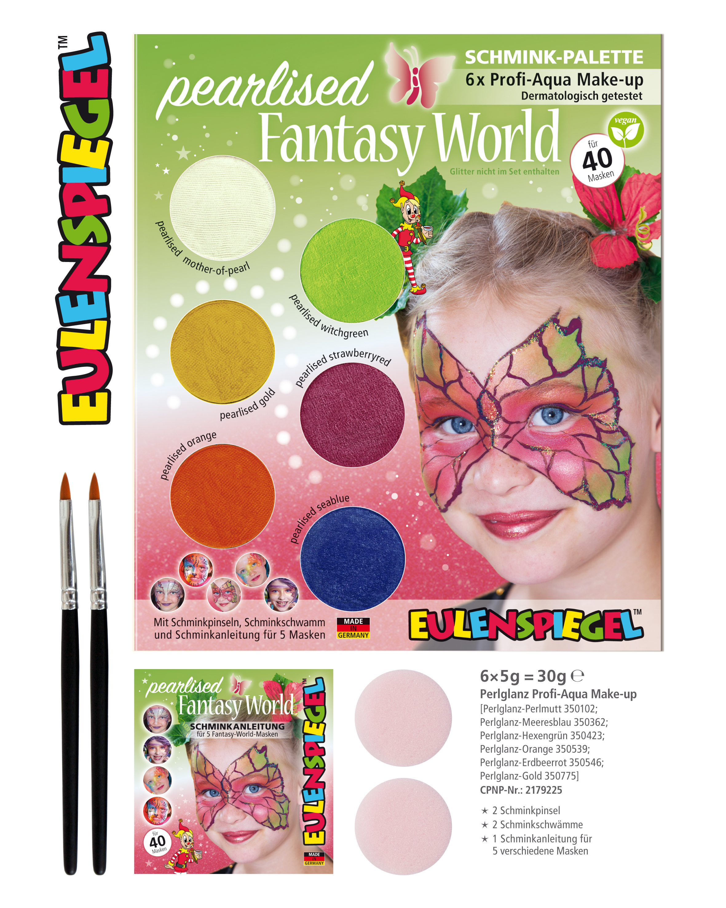 Die Palette besteht aus sechs Eulenspiegel-Farben (á 3,5 ml bzw. 5g), 2 Pinseln, 2 Schminkschwämmen sowie einer vollständigen Anleitung in Schritt-für-Schritt-Darstellung für die jeweiligen Motive.