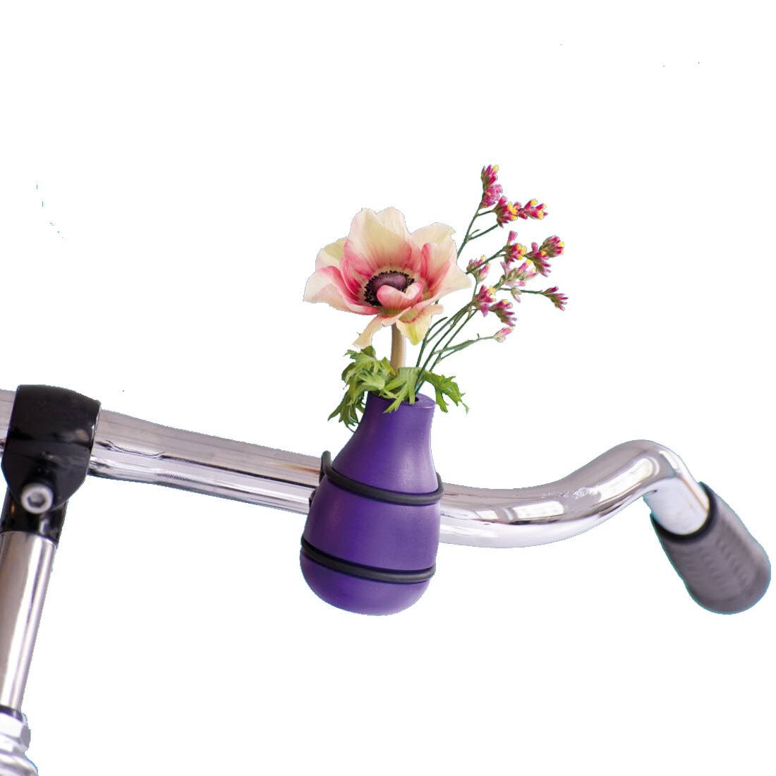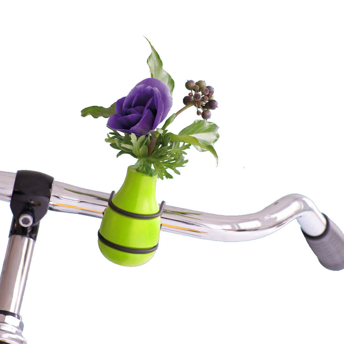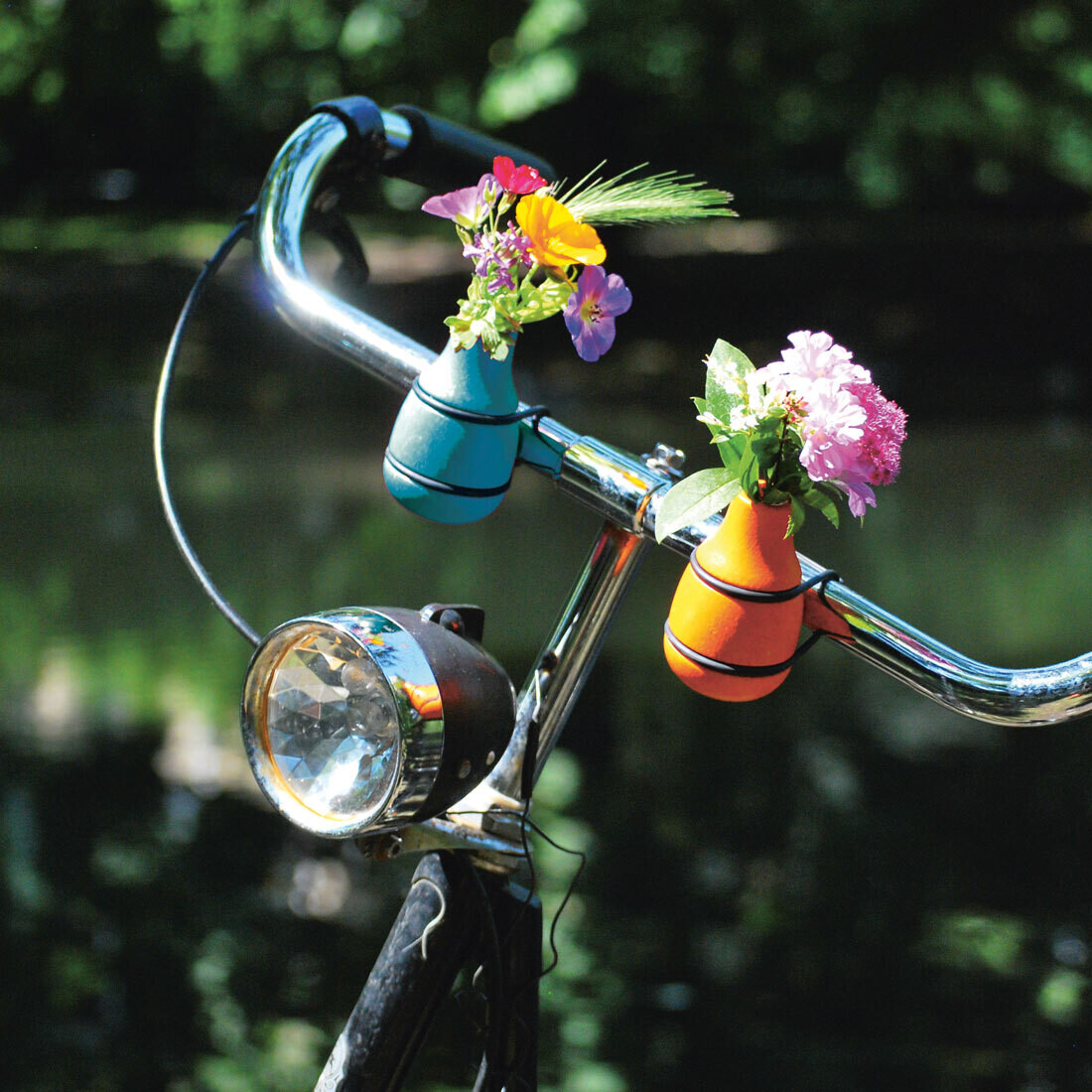 Die Vase wird einfach mit einem Gummi am Lenker befestigt - ein eingelassenes Kunststoffröhrchen nimmt die Blumen und das Wasser auf. So können die Blumen vom Wegesrand Dich ein Stück des Weges begleiten.