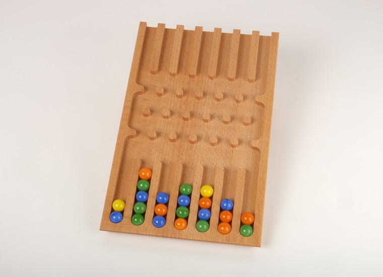 Klack! Klack! Klack! Die oben eingeworfenen Murmeln bahnen sich durch regelmäßig angeordnete Hindernisse ihren Weg. Wo wird sie landen? Das Spielbrett ist aus massivem Holz gefertigt und wird schräg aufgestellt. Welchen Lauf die Murmeln nehmen ist die große Frage. Zufall? Oder vielleicht doch nicht?