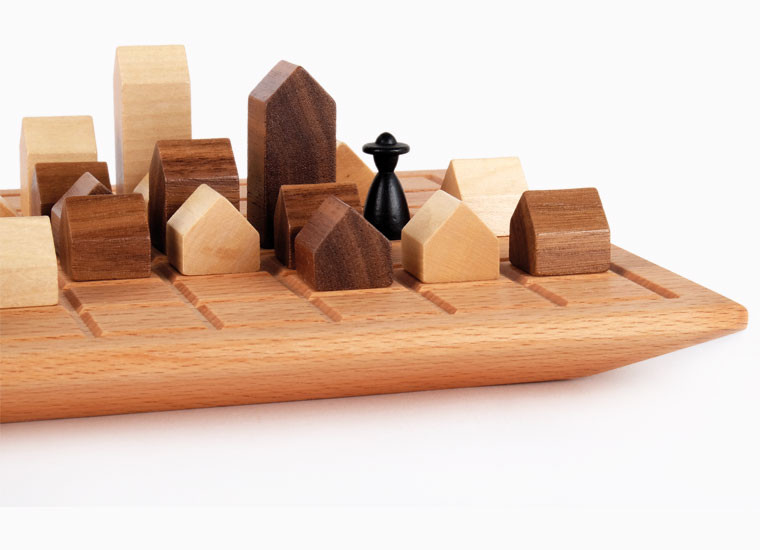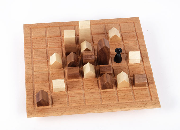 • Spielsteine sind Gebäude aus Nussbaum und Ahorn