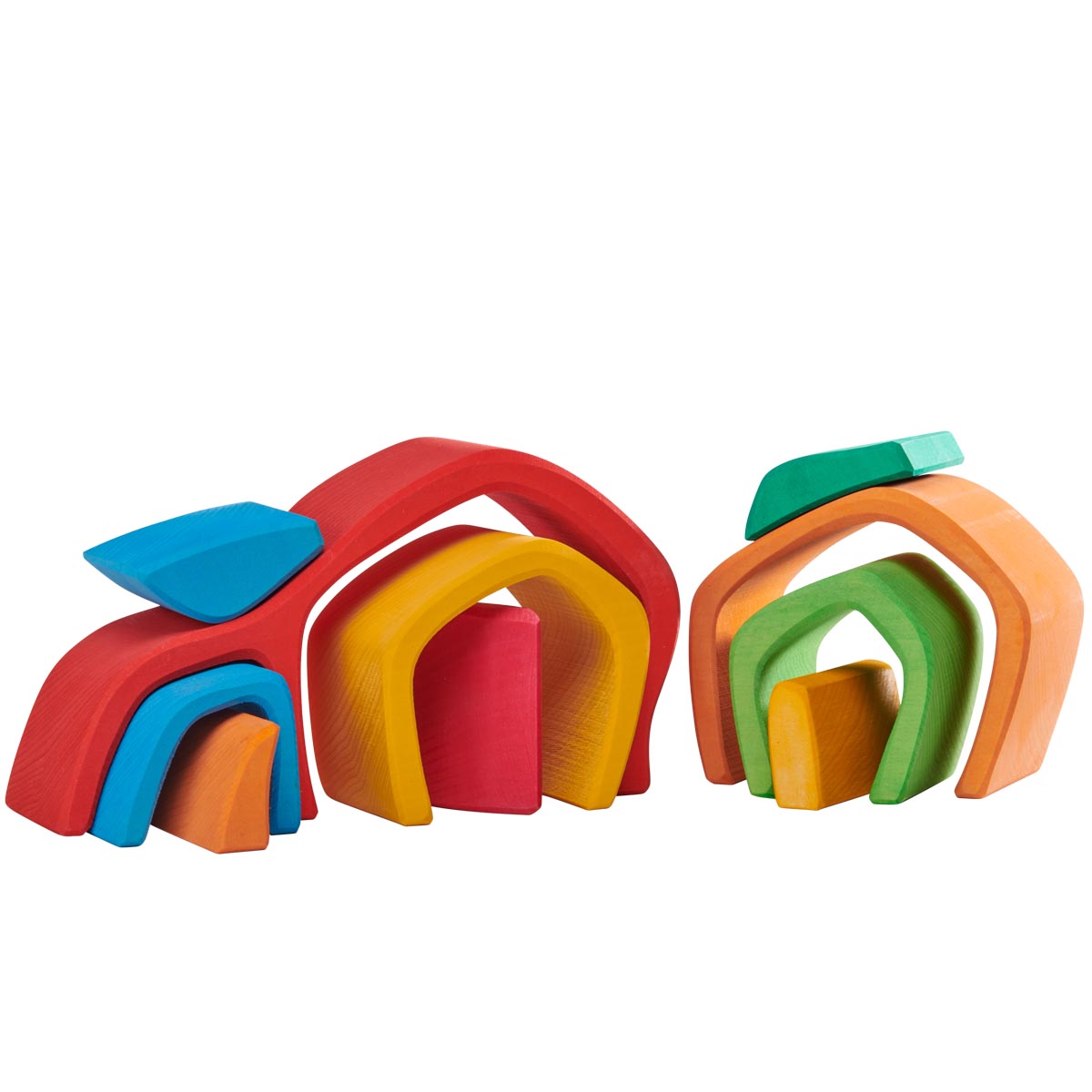 Wie ein Puzzle kann das schöne Gewölbe-Formenspiel auseinandergenommen und wieder zusammengefügt werden. Die einzelnen Bauteile und Bögen können aber auch ganz anders aufgebaut werden, sodass etwas Neues entstehen kann. Betrachtet man die einzelnen Formen als Höhlen oder Häuschen, so können hier auch Püppchen oder Holz- bzw. Filztiere einziehen. Und die schönen Bogenformen dürfen von den Kindern kreativ in Spielelandschaften eingebettet werden.