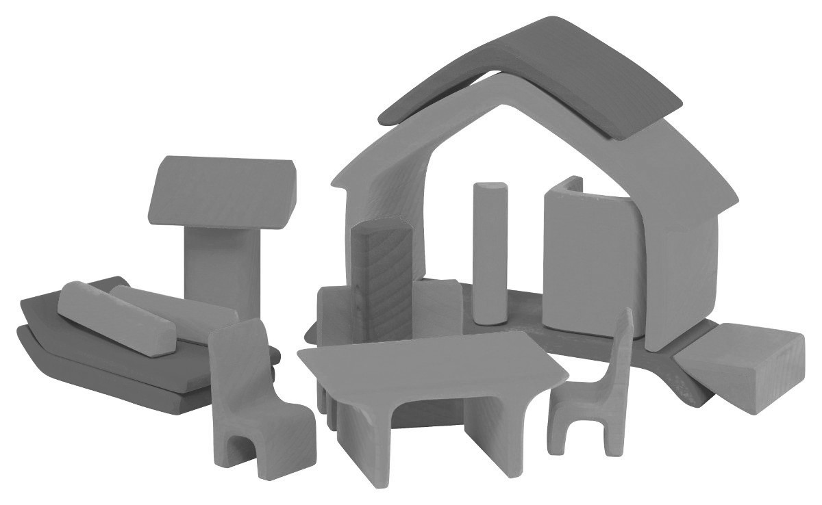 Alles passt ineinander! Das Möbelhaus von Glückskäfer lässt sich wie ein Puzzle zusammenstecken. Mit den Holzteilen kann eine ganze Puppenhauswelt aufgebaut werden: Tisch, Stühle, Hocker, Betten, ein Schuppen. Oder baue ich etwas ganz anderes daraus?
