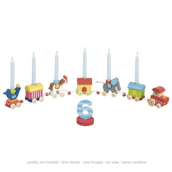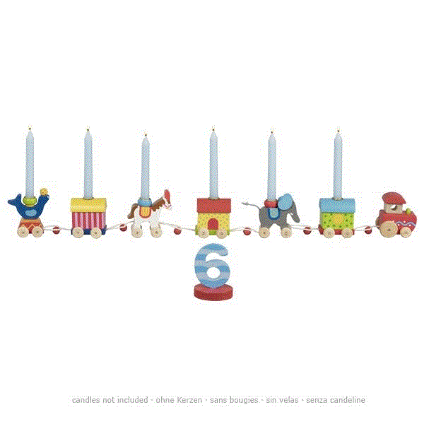 Der lustige Geburtstagszug zieht über den Tisch des Geburtstagskindes. Neben den bunten Zirkuswagons sind auch ein Elefant, ein Pferd und ein Seehund, der einen Ball auf seiner Nase balanciert, mit von der Partie! Ein buntes Spektakel zu einem ganz besonderen Tag. Auf den Wagons und den Rücken der Tiere können Kerzen angebracht werden.