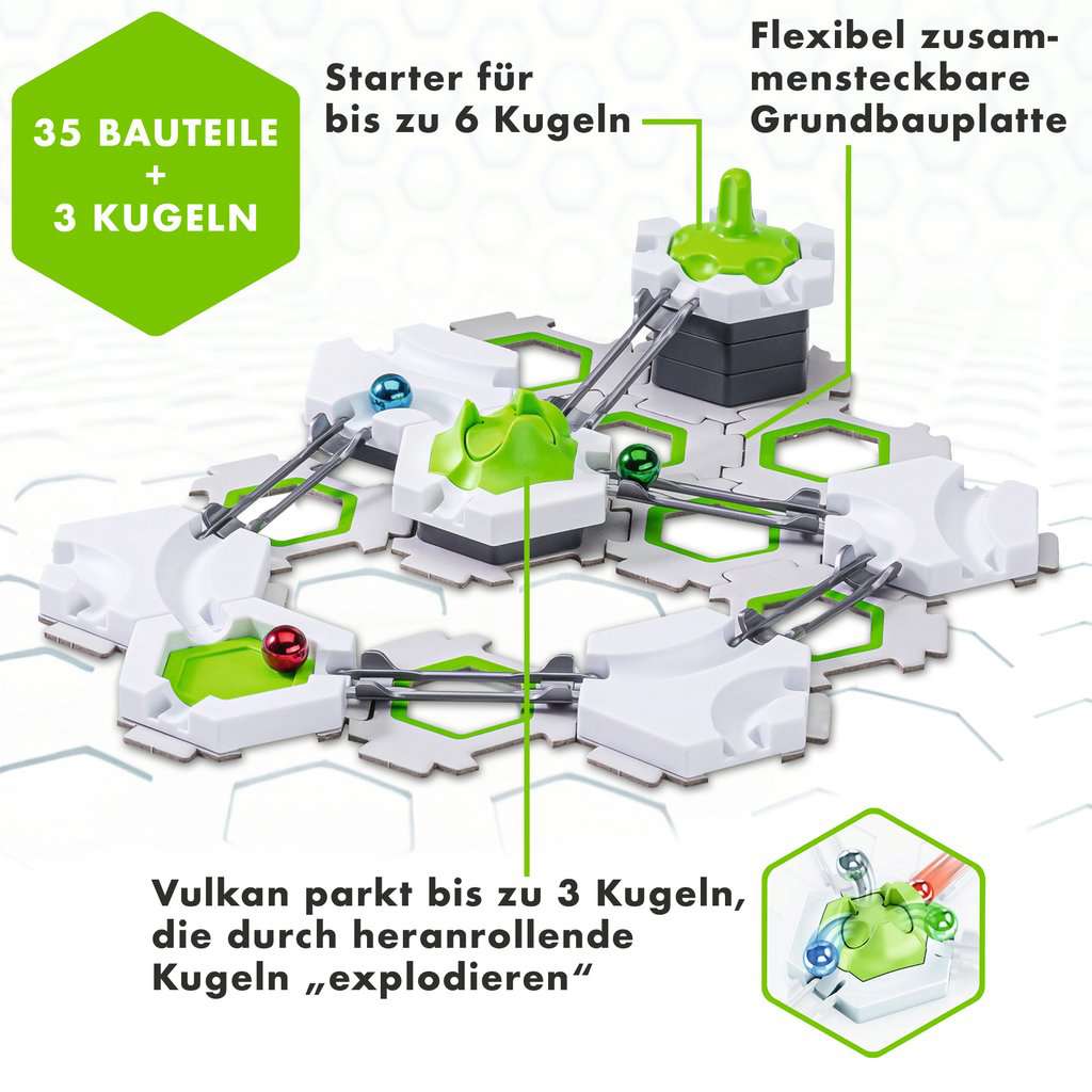 • Inhalt: 1 Anleitungsheft, 14 kleine hexagonale Bodenplatten, 1 Spinner Starter, 1 Kugel blau, 1 Kugel rot, 1 Kugel grün, 1 Ziel, 4 Kurven, 1 2in1, 1 Schiene mittel, 6 Schienen kurz, 5 ganze Höhensteine, 1 Vulcano