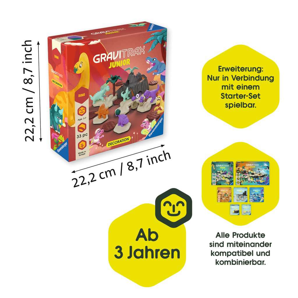 Die Juniorserie von Ravensburger ermöglicht Kindern ab 3 Jahren einen kindgerechten Einstieg in die GraviTrax Kugelbahnwelten. Die Kinder erschaffen ihre eigenen Kugelbahnwelten, die immer neu dekoriert werden können, so dass individuelle Bahnen und Landschaften entstehen. Bau- und Spielspaß werden dabei vereint. GraviTrax Junior kann durch Erweiterungen mit Bauteilen oder besonderen Elementen beliebig erweitert werden. Motorische Fähigkeiten und räumliches Denken werden durch das freie Konzipieren der Kugelbahnen gefördert. Durch das Erforschen des Rollverhaltens der Kugeln wird das Prinzip von Ursache und Wirkung hautnah erlebt. Das Spielen mit den (Tier-)Figuren und das Dekorieren der Themenwelten fördern das kreative Rollenspiel und die Fantasie der Kinder.