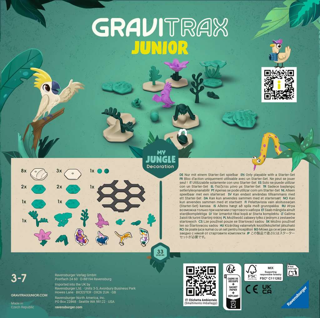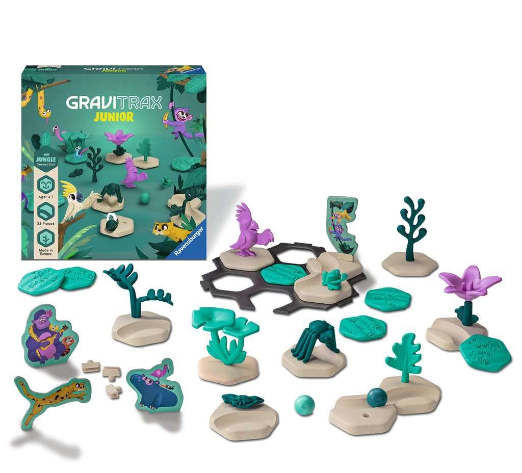 Dieses GraviTrax Junior Erweiterungs-Set Jungle bringt neue Spielmöglichkeiten in die vorhandene Kugelbahn. Das Set enthält lustige Bahn- und Deko-Elemente, um deine Kugelbahn weiter zu gestalten. In diesem Set natürlich mit Dschungelmotiven!