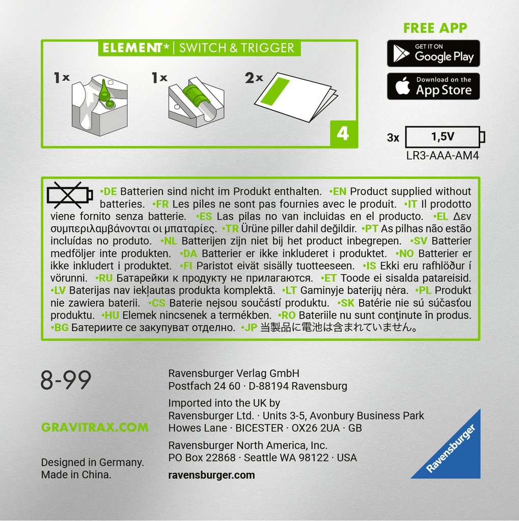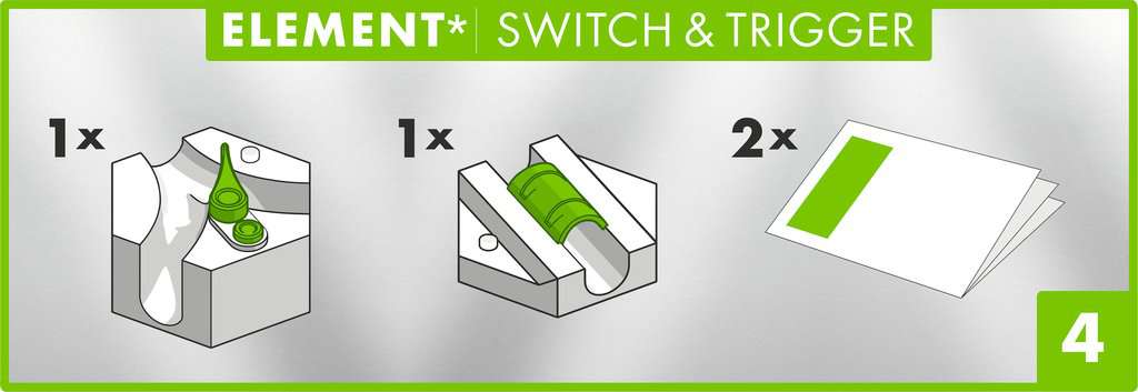 Die Power Elemente haben Funkverbindungen und z.T. Elektromotoren. In Kombination mit einem weiteren POWER Stein wird der Bahnverlauf mittels Funkverbindung beeinflusst. Durch geschicktes Einbauen von elektronischen GraviTrax POWER Elementen wird der Verlauf der Kugeln kontrolliert und verändert. Mit dem Trigger können in Kombination mit anderen POWER Steinen, wie der Switch in diesem Set, aber auch mit Starter oder Lever, unsichtbare Verbindungen geschaffen werden. Mit dem Controller können diese Verbindungen sogar gesteuert werden (Nicht im Produkt enthalten).