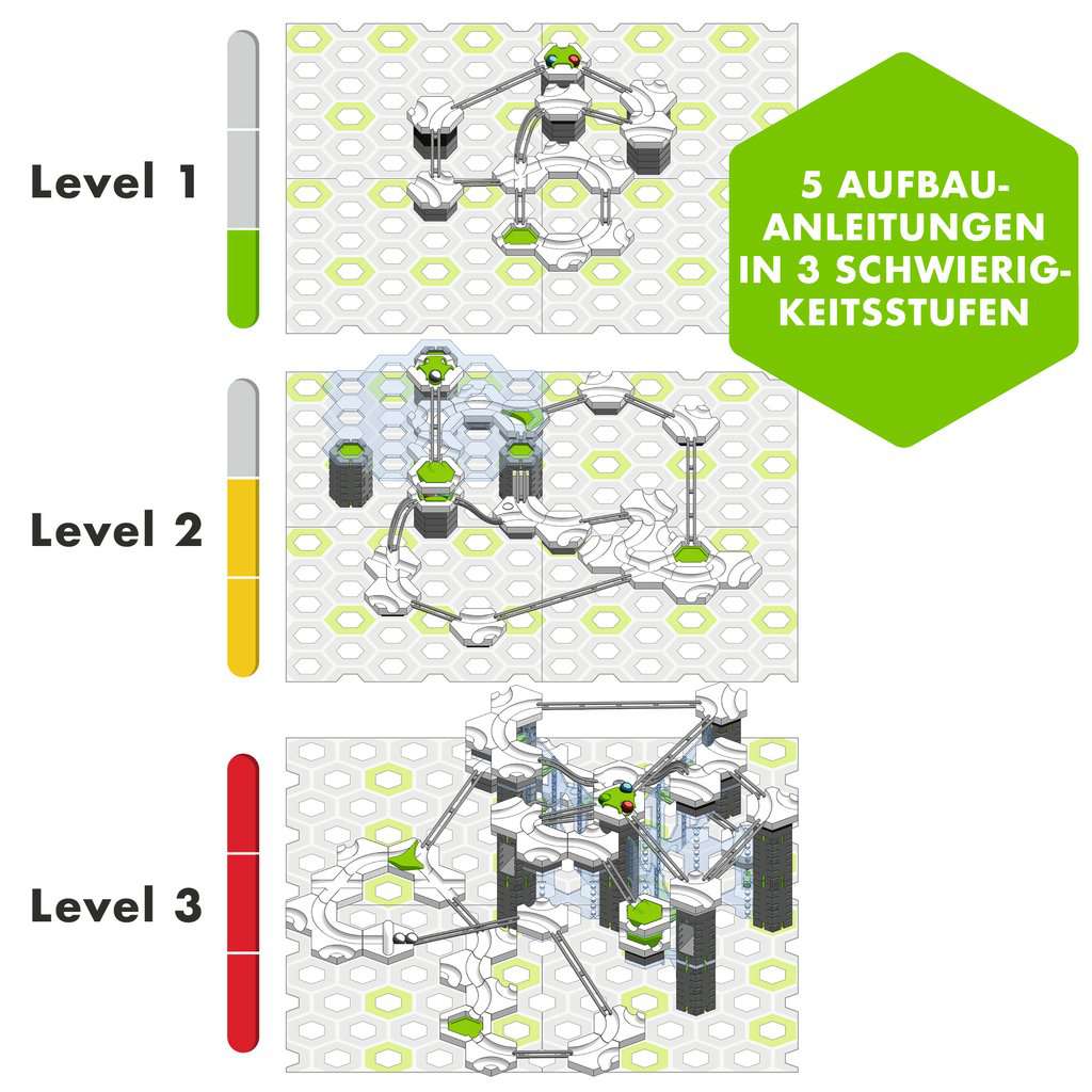 • Inhalt: Anleitung, Bauplanheft, 4 Bodenplatten, 1 transparente Ebene, 6 Kugeln, 12 Säulen, 2 Wände lang, 2 Wände mittel, 1 Wand kurz, 16 Balkone einfach, 4 Doppelbalkone, 8 Bernoulli-Kunststoffschienen kurz, 3 Kunststoffschienen lang, 6 Kunststoffschienen mittel, 9 Kunststoffschienen kurz, 20 Höhensteine groß, 9 Höhensteine klein, 28 Kurven, 4 Kreuzungen, 2 Weichen, 1 3-in-1, 1 Wirbel, 1 Startstein, 1 Element Gauß-Kanone, 1 Zielleiter, 4 Basissteine, Einsätze für die Basissteine: 2 Fänger, 1 Freifall, 1 Splash, 1 Ziel