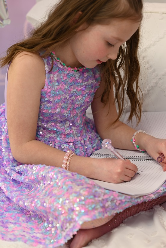 Das lila Party Pailetten Kleid von Great Pretenders ist ein echter Hingucker. Tausende kleine lila-bunte Pailetten glitzern in der Sonne, ideal für die nächste Geburtstagsparty, das nächste Schulfest oder einfach einen wunderschönen Tag.