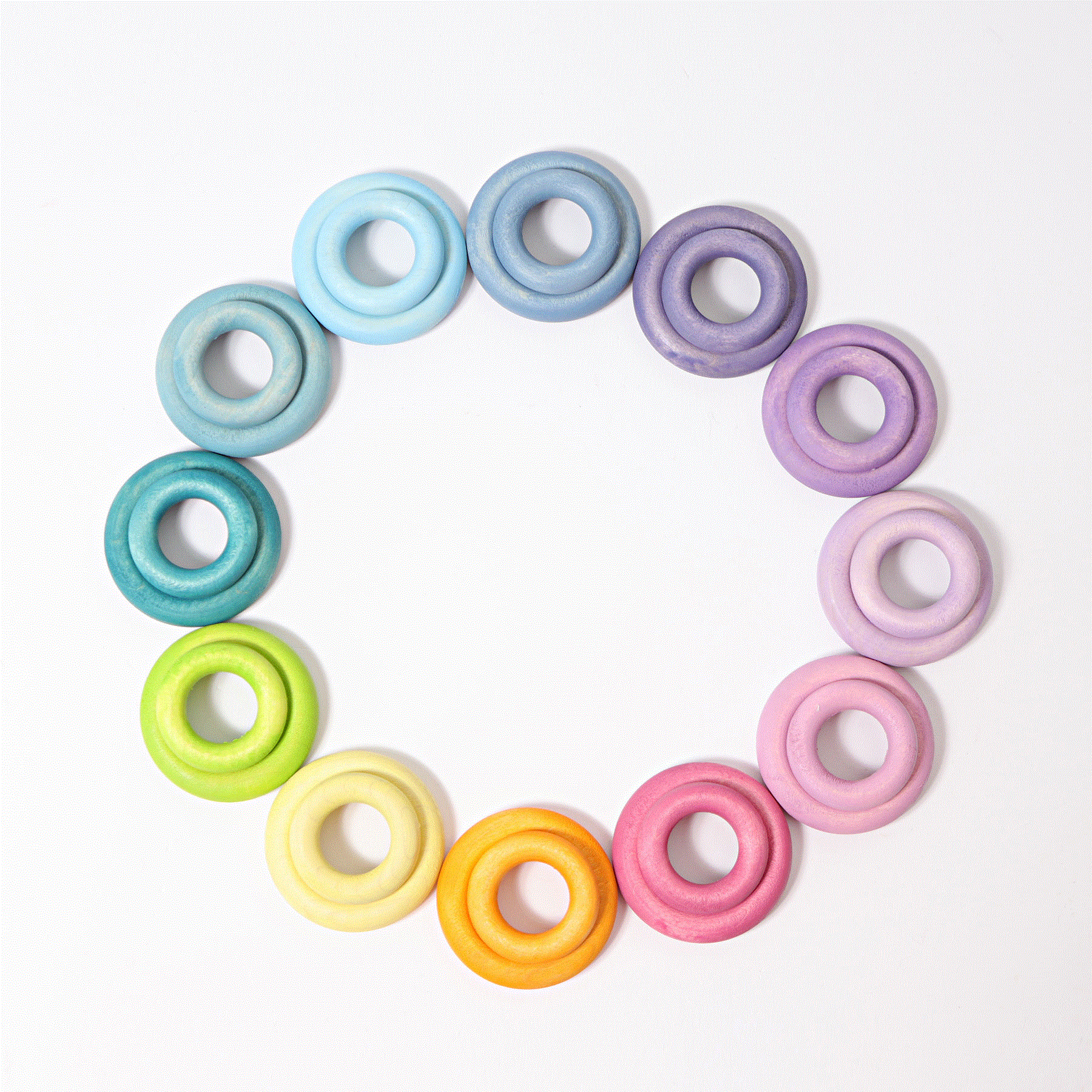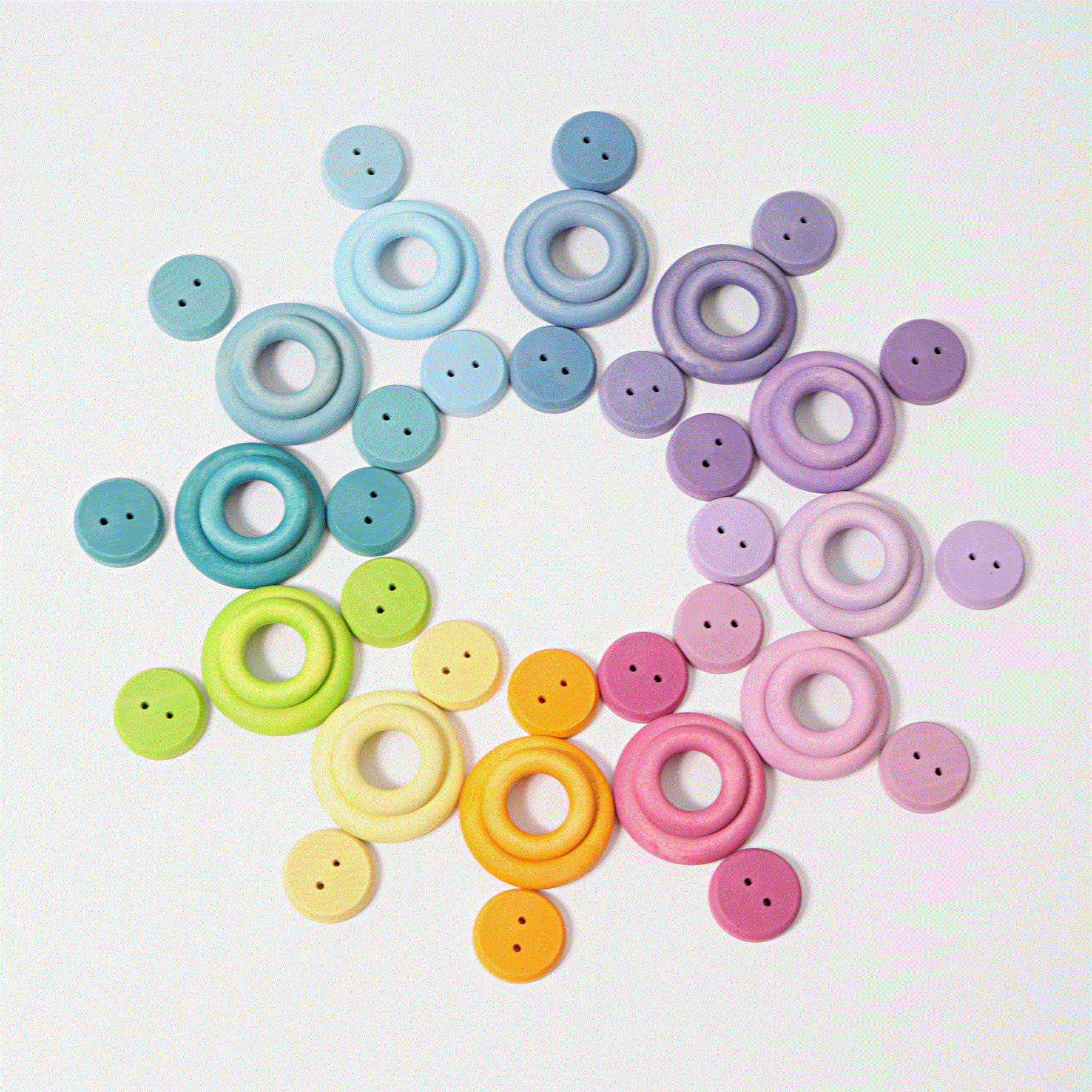 Wer sagt, dass man nur mit Bauklötzen bauen kann? Die pastellfarbenen Bauringe sind eine super Ergänzung zu den großen und kleinen Massivholzkugeln oder den Regenbogenfreunden. In der Kombination entstehen wundervolle Bau- und Stapelspiele, ausbalancierte Kugeltürmchen oder lustige Stapelmännchen. Im Set enthalten sind 24 Holzringe in 2 Größen in super schönen Pastelltönen