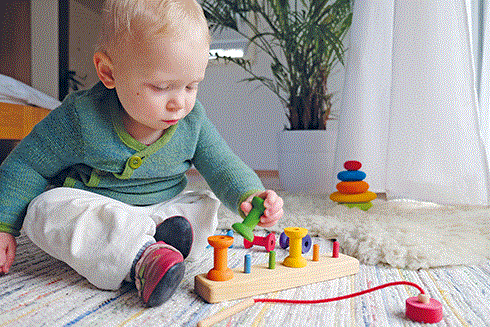 Die bunten Holzspule, die an leere Garnrollen erinnern, lassen sich farblich sortiert auf ihre 6 Steckplätze auf dem Brett ordnen. Da sie ganz durchbohrt sind, können sie aber auch aufgefädelt werden. Auch umwickeln kann man sie, mit dicken Wollfäden zum Beispiel. Kullern lassen, stapeln, Stäbchen reinstecken, mal schauen was noch so alles passiert!