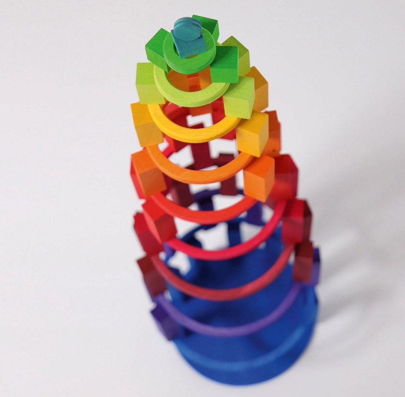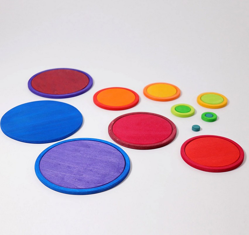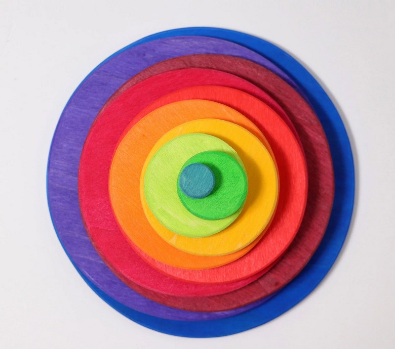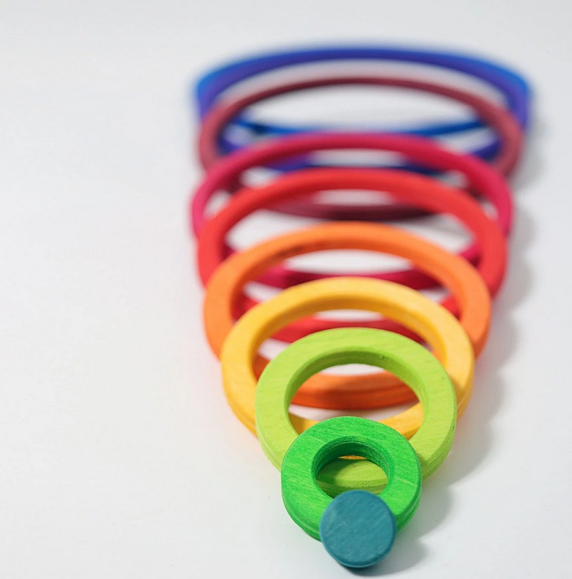 Mehr Regenbogen-Bauteile aus Holz von Grimm´s ! Zehn Kreise und zehn Ringe laden zu neuen Bau- und Legespielen ein.