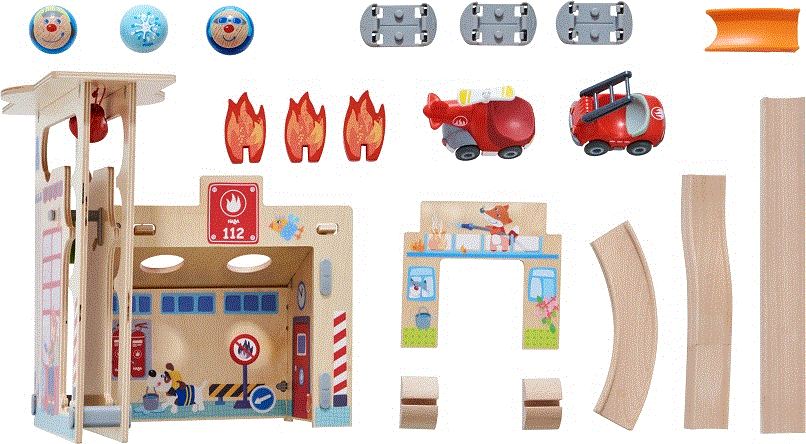 Tatü-Tata die Feuerwehr ist auch bei Kullerbü als Spielbahn da! Die Ergänzung Feuerwehrwache ist eine super Erweiterung für die Kullerbü Kugelbahnen. Schnell wie die Feuerwehr rast hier die Kugel den Flammen entgegen und kann diese, bevor ein Unglück passiert, löschen. Passend dazu sind auch die Spielbahnen Feueralarm und das Themenset Feuerwehr! Aber nun heißt es ran die Kugeln!