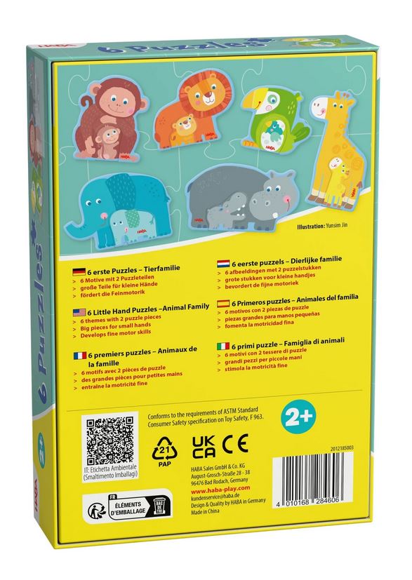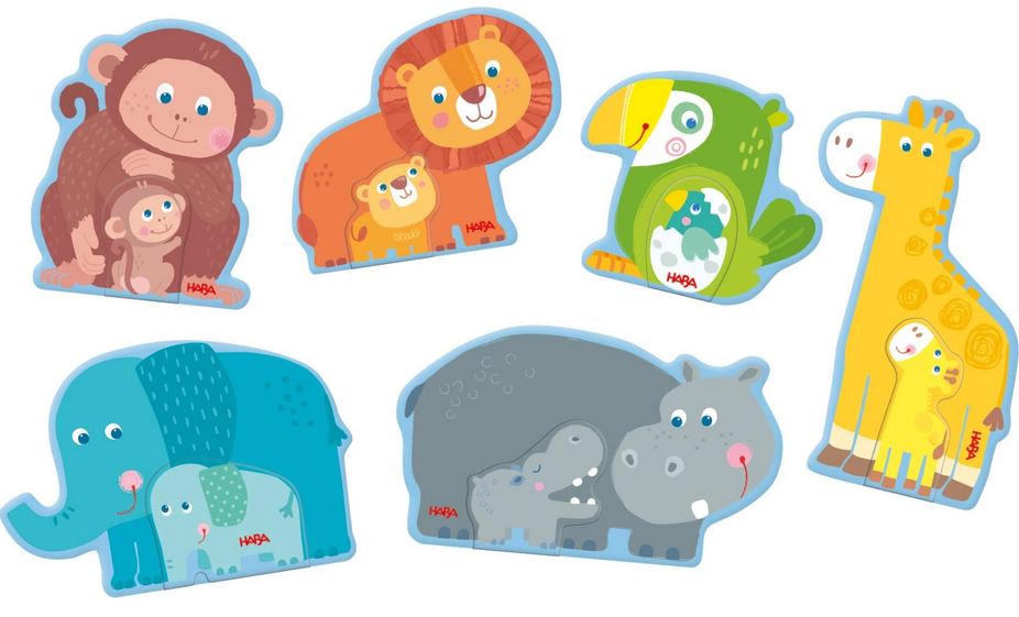 6 erste Puzzles Tierfamilie von Haba sind ein prima Einstieg für Kleinkinder in die wunderbare Puzzlewelt. Alle Puzzle bestehen aus 2 extragroßen Teilen, die sich sehr gut anfassen und zusammenbauen lassen. Schöne Tiereltern- und Kindermotive machen Spaß und regen zum Erzählen an.
