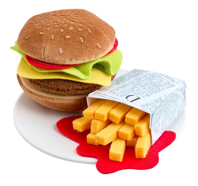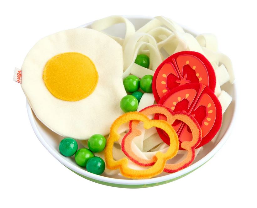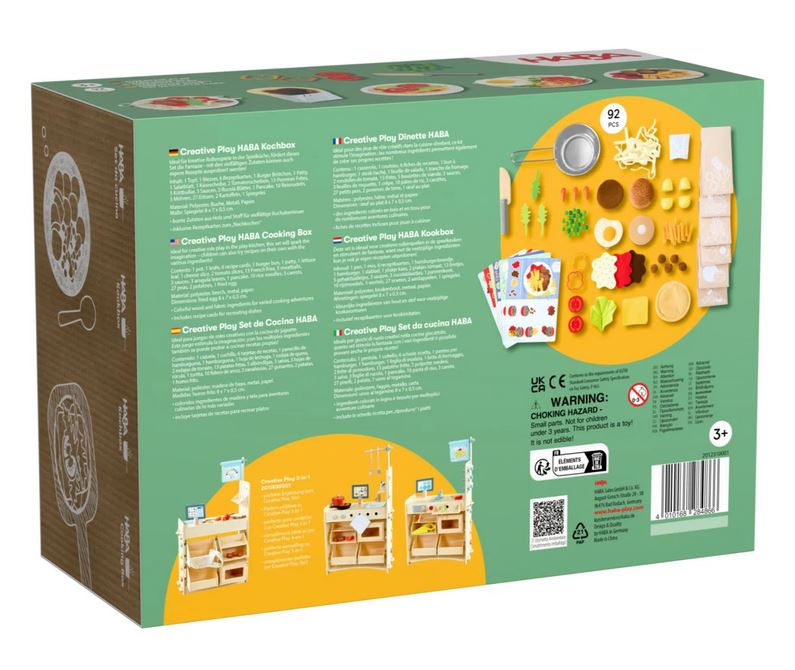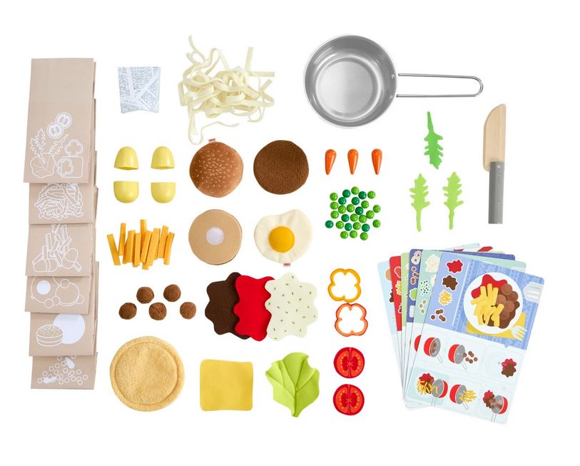 Mit Creative Play Kochbox von Haba werden Kinder zu Köchen! Wild wirbeln die Zutaten aus hochwertigem Holz und Stoff durch die Luft - schwups! - direkt in den Kochtopf! So entstehen leckere Gerichte wie Burger mit Pommes, Wraps, Ramen oder Köttbullar mit frischem Gemüse und Kartoffeln. Bei der Zubereitung helfen die mitgelieferten Rezeptkarten, aber es können auch eigenen Gerichte erfunden werden! Und danach: Zu Tisch, das wird lecker!