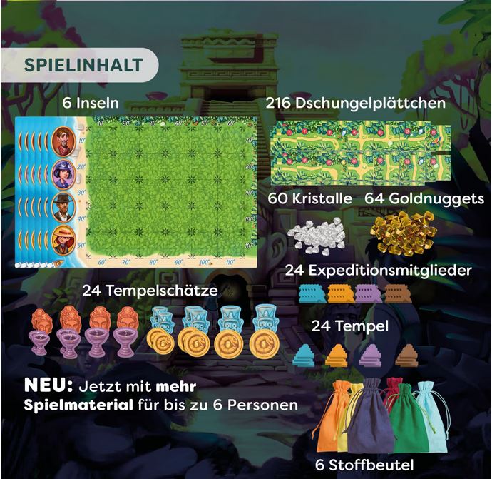 • Inhalt: 216 Dschungelplättchen (36 pro Person), 24 Expeditionsmitglieder (4 pro Person), 24 Tempel (4 pro Person), 24 Tempelschätze, 6 Inseln (1 pro Person), 6 Stoffbeutel (1 pro Person), 64 Goldnuggets, 60 Kristalle.