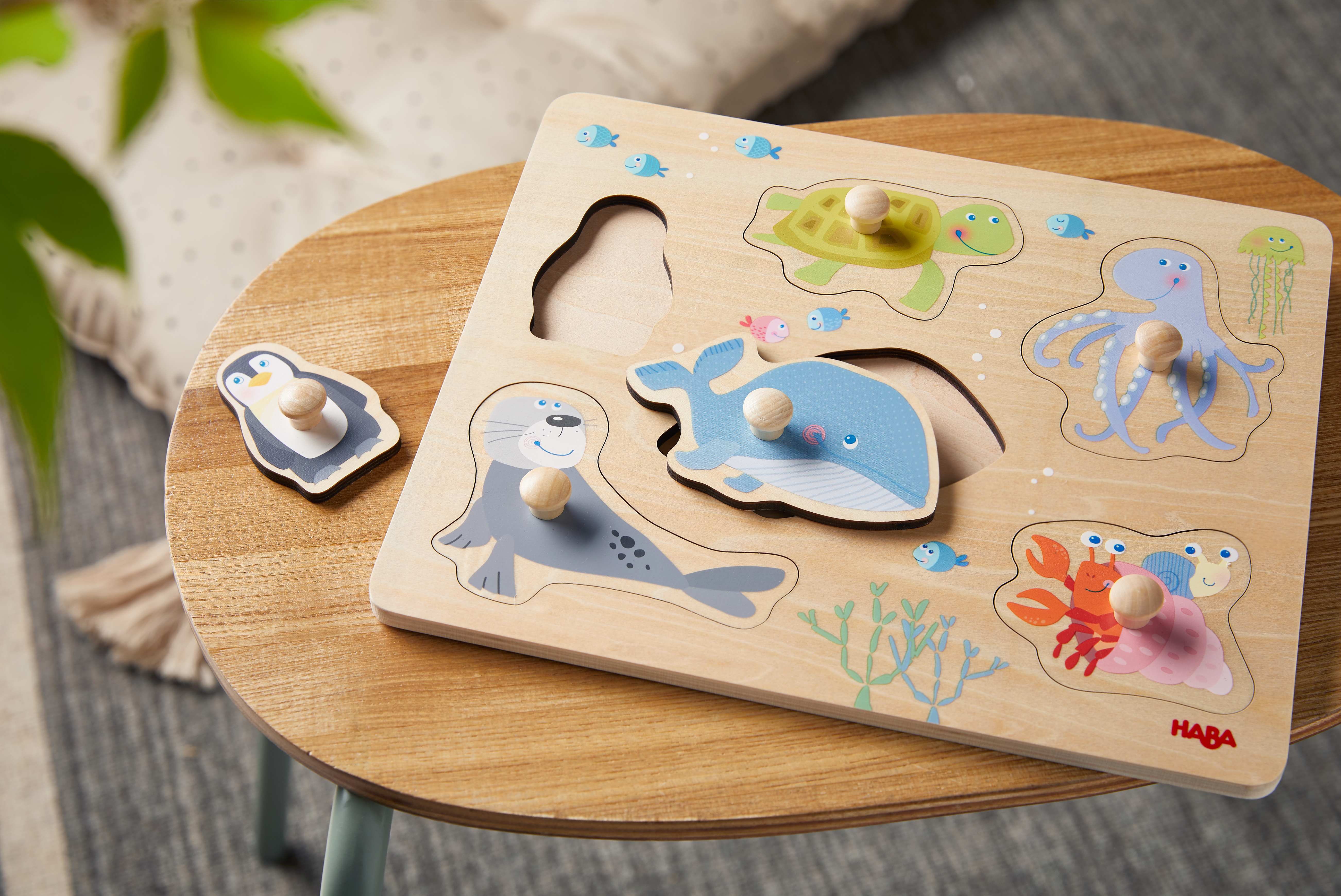 Das Haba Greifpuzzle Meerestiere ist ein tolles erstes Puzzle für Kinder ab 12 Monaten. Die niedlichen Puzzleelemente verfügen über griffige Knöpfe zum praktischen Anheben und Einsetzen. So kann ganz einfach immer wieder aufs Neue probiert, welches Teil in welche Aushöhlung passt.