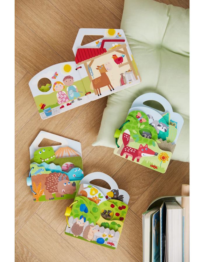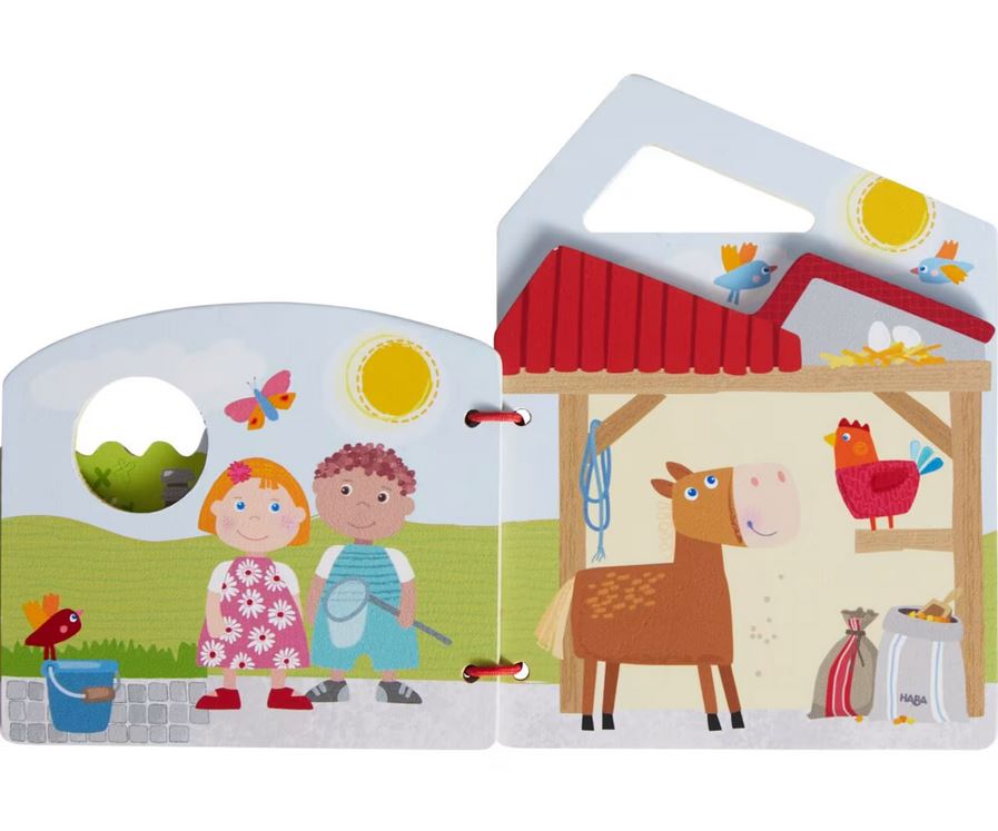 Das Haba Holz-Babybuch Traktor ist das richtige erste Buch für Bauernhof-Fans. Der knallrote Traktor knattert über die Felder, die Tiere müssen gefüttert werden während Hund und Katze passen gut auf den Bauerhof aufpassen. Und am Himmel scheint hell und warm die Sonne. Hier lassen sich tolle Geschichten erzählen, so vergeht der Tag auf dem Bauernhof ganz schnell! Und überall hören wir die ganz besondere Geräusche, die sich prima mit dem Mund nachmachen lassen. Die unterschiedlich geformten Seiten machen Spaß und Lust auf Entdeckungen und mit dem praktischen Griffloch läßt sich das Buch überall hintragen.