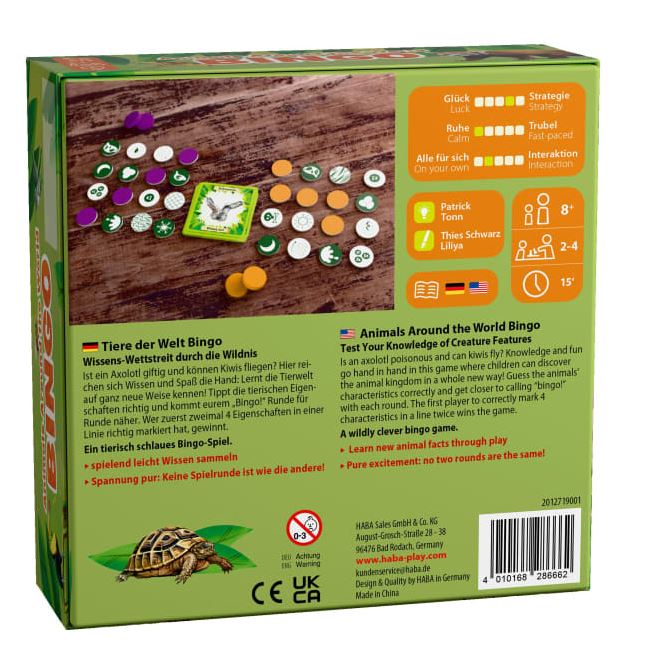 Bingo-Time! Das Kinderratespiel Tiere der Welt Bingo von Haba liefert einen spannenden Rate-Wettlauf bei dem die Kinder ganz nebenbei ein Menge über die Tierwelt lernen. Wer zuerst zweimal 4 Eigenschaften in einer Linie richtig markiert hat, gewinnt.