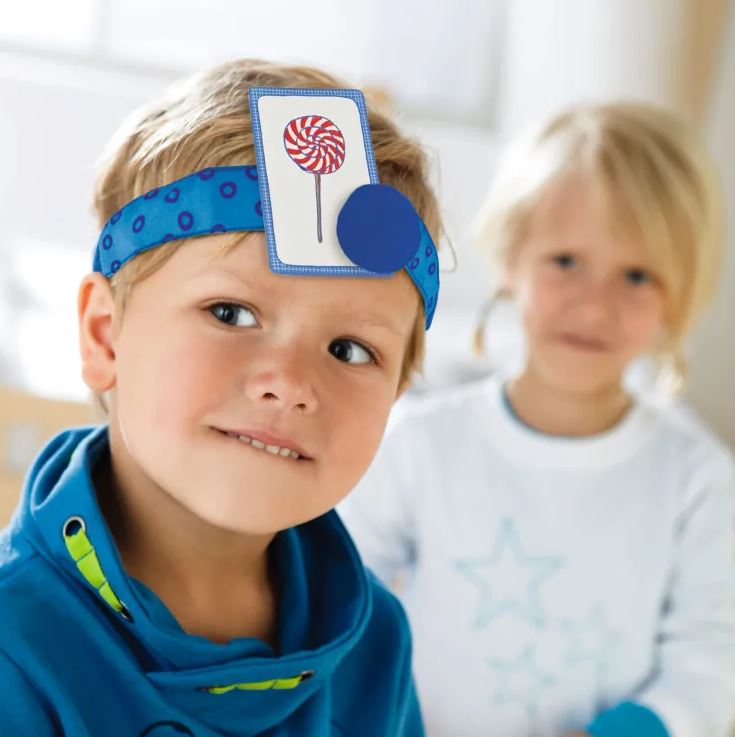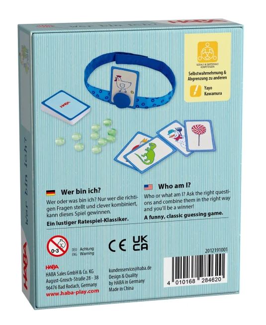 Beim Kinderratespiel Wer bin ich? von Haba ist doppeltes Köpfchen gefragt: Denn die Karte am Kopf des Ratenden ist mit einem Magneten an einem Stirnband befestigt und nur die anderen Person sieht das aufgedruckte Bild, das erraten werden muß. Jetzt muß der Ratende durch geschickte Fragen herausfinden, was oder wer er ist: Ein Bäcker? Eine Gießkanne, ein Löwe? Oder ...?