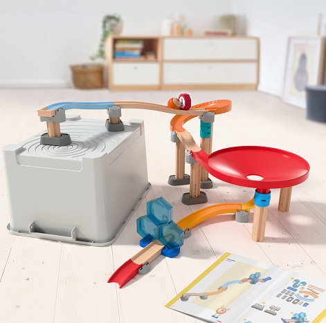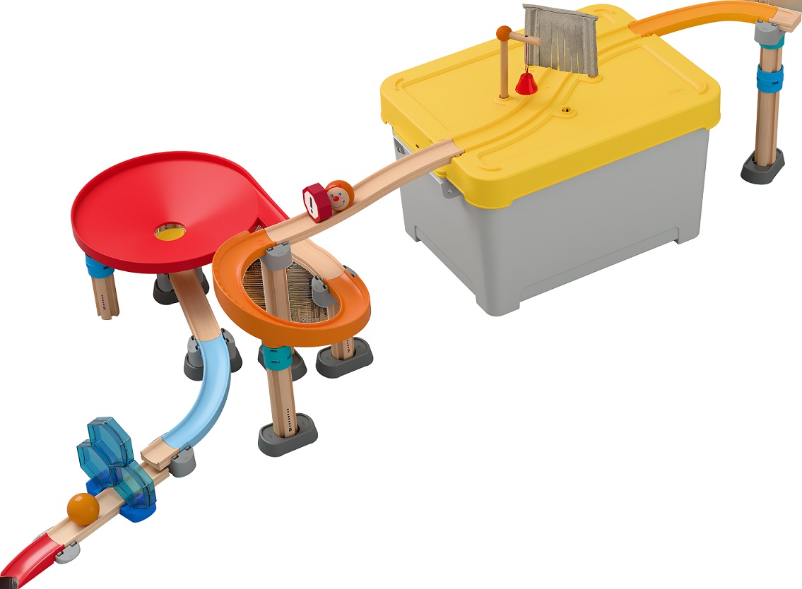Der Clou: Die Kiste kann auch integriert werden! Die Bauteile der Box eignen sich für verschiedene Altersstufen, damit das Spielzeug lange interessant bleibt. Ein großes Highlight ist der rote Kugeltrichter. Dann Ratterkurven und Klingeltunnel, die große Kugel bringt die Bausteine zum Einsturz – cool! Während die Allerkleinsten am liebsten die Kugel erkunden und sie staunend beim Herumkullern beobachten, möchten die Großen schon beim Teile-Heraussuchen und Aufbauen helfen. So kann aus einer einzelnen Geraden mit der Zeit eine komplexe Bahn entstehen – immer angepasst an die jeweiligen Entwicklungsschritte des Kindes. Verschiedene Elemente sorgen für extra Spielspaß. Tipp: Kreative können ihre Bahnen z. B. mit Büchern als Tunnel oder Bahnverlängerung immer neu gestalten.