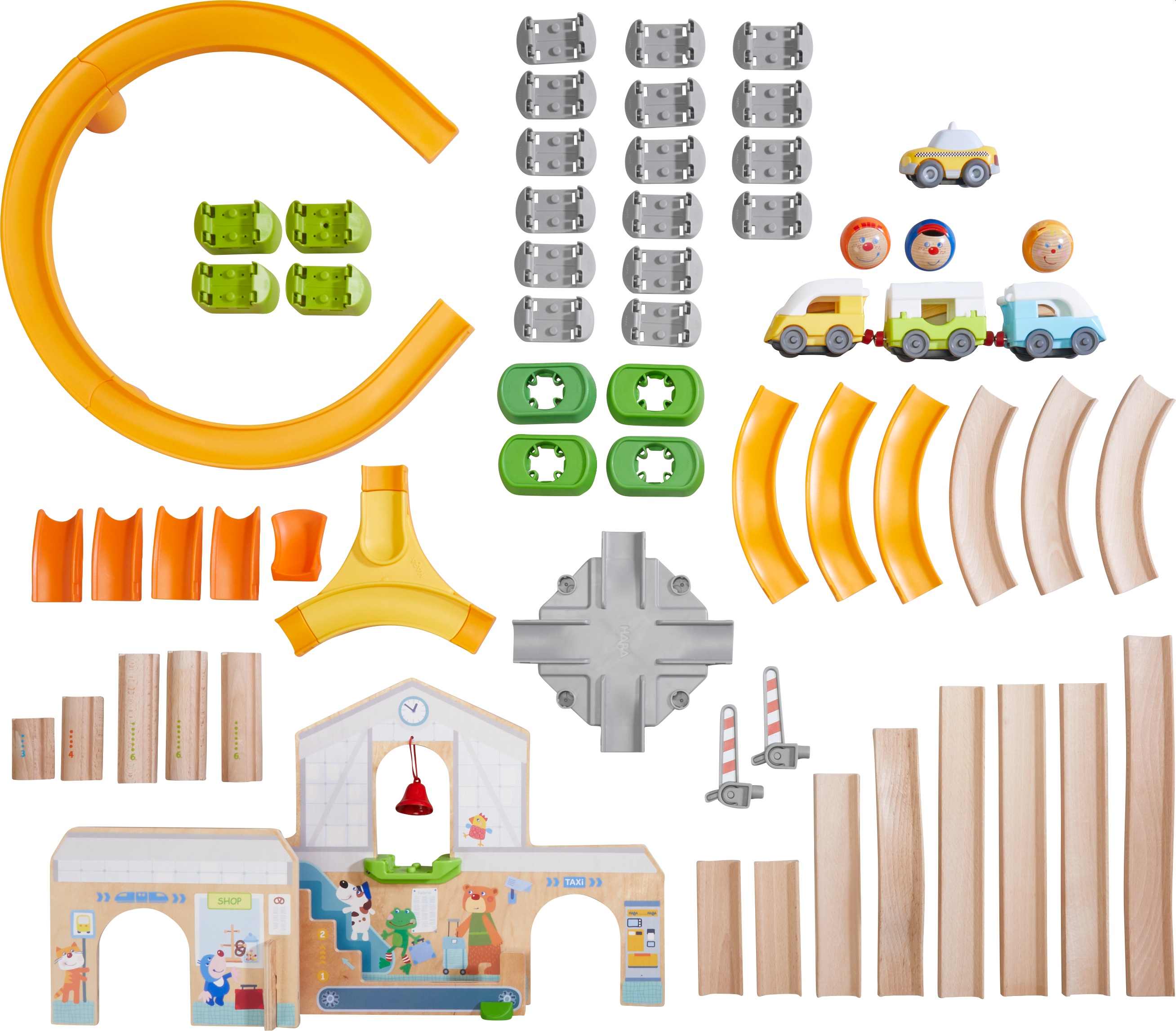 • Inhalt: 1 Kulisse Bahnhof mit Glöckchen, 1 Schnellzug, 1 Taxi, 1 Kugel Dina Dienstreise, 1 Kugel Uli Urlaub, 1 Kugel Lokführer Loris, 1 Straßenkreuzung, 2 Bahnschranken, 24 Verbindungselemente, 1 Startrampe, 4 Abfahrtsrampen, 6 Geraden, 1 Rampe, 5 Säulen, 1 Drehweiche, 3 Wellenkurven, 1 Steilkurve, 3 Kurven, 1 Wellenbahn.