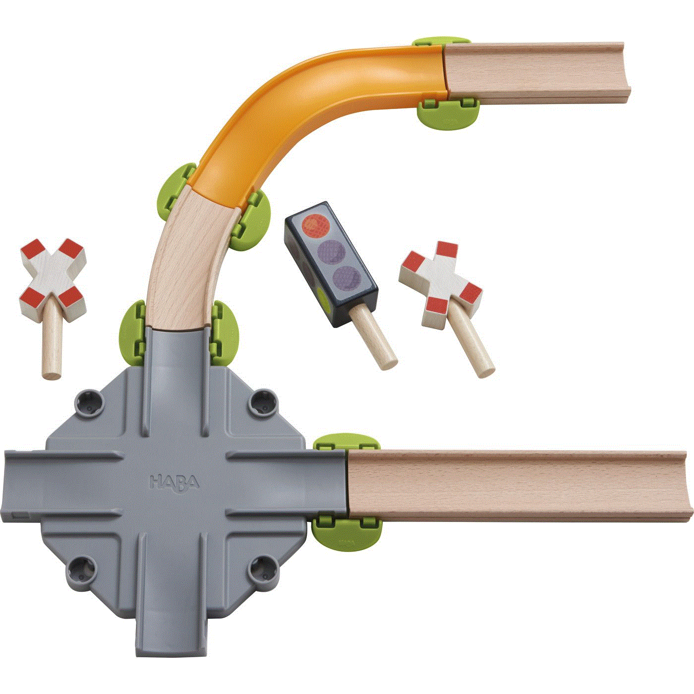 • Inhalt: 1 Straßenkreuzung, 1 Ampel, 2 Verkehrszeichen, 2 Geraden, 1 Wellenkurve, 1 30°-Kurve, 4 Bodenverbinder.