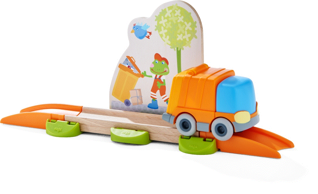 • Inhalt: 1 Kulisse Müllabfuhr, 1 Müllauto, 1 Gerade, 2 Abfahrtsrampen, 2 Verbindungselemente, 1 Kulissenklemme, 1 Kugel Frido Feuerwehrmann.