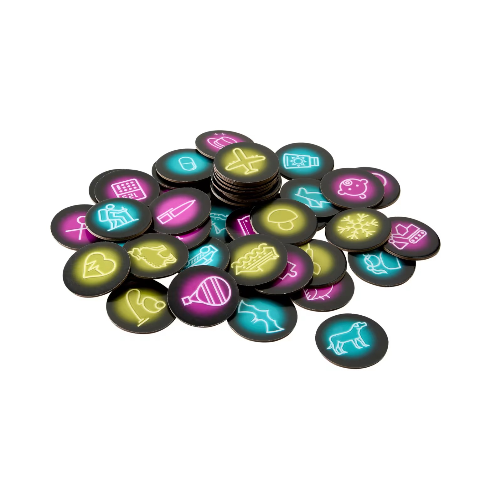 In der Röhre befinden sich 50 doppelseitige Motivplättchen, die in die Tischmitte geschüttet werden.