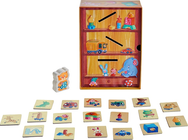 Der Spielkarton wird im Nu zu einem Spielzeugregal aufgestellt, in das die Spielzeuge auf Spielplättchen richtig einsortiert werden sollen. Es gibt verschiedene Spielvarianten.