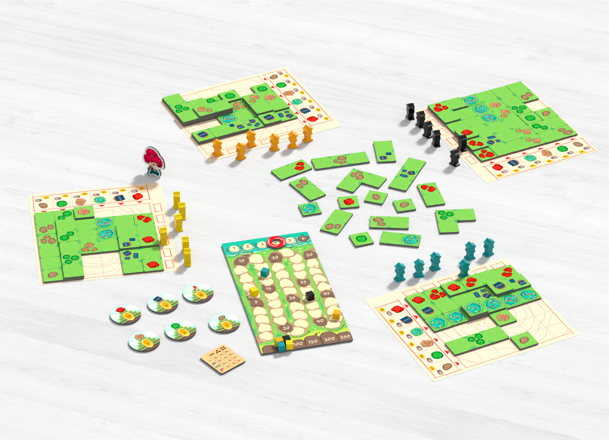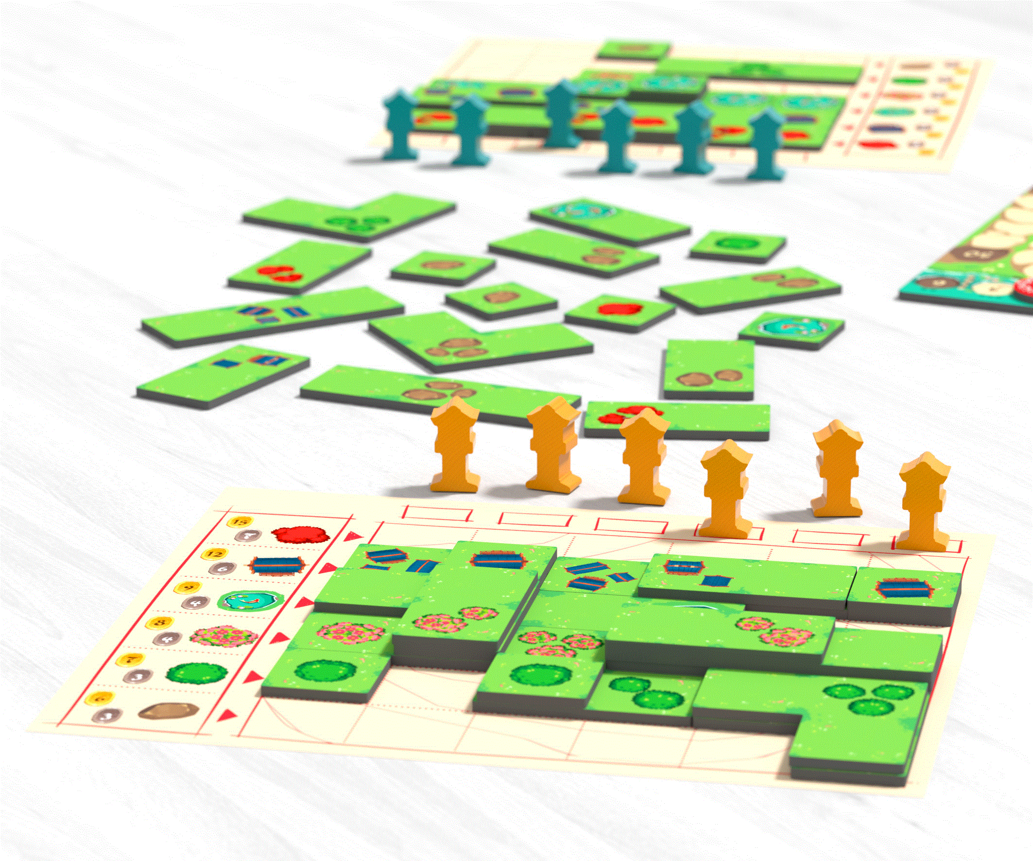 Auf der eigenen Legetafel werden in Reihen und in verschiedenen Ebenen Spielplättchen mit den Symbolen für Büsche, Bäume, Steine oder Teiche angelegt. Dies muss taktisch klug geschehen, denn wer vielschichtig geschickt baut, bekommt viele Punkte.