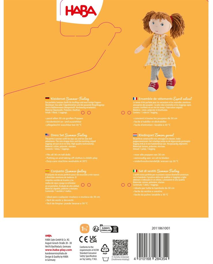 Puppen Kleiderset Summer Feeling, 2-teilig von Haba passt für alle 30 cm großen Puppen und bringt tolle Sommer-Stimmung ins Puppenleben! Das sieht direkt nach Strand aus, nach Möwen, Wellen, ... hm! Die Kleider lassen sich dank Druckknöpfen ganz einfach an- und ausziehen.