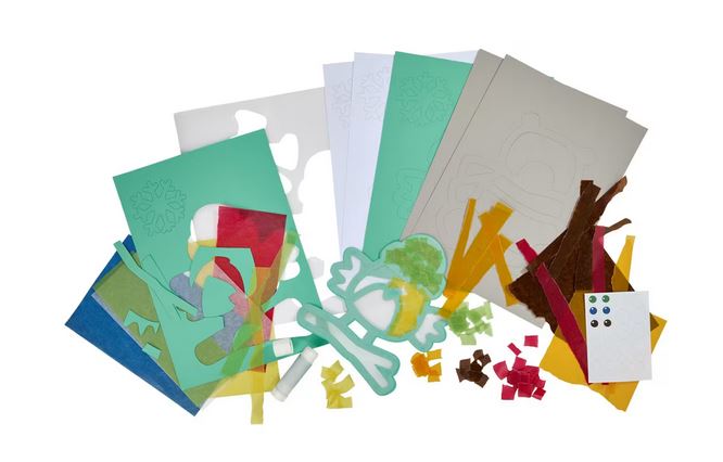6 Bogen farbiger Fotokarton, 1 Bogen weißes Transparentpapier, 7 Bogen farbiges Transparentpapier, 1 Stickerbogen, 1 Anleitung.
