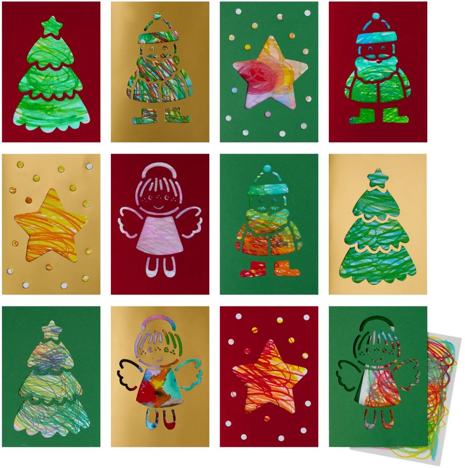 • Inhalt: 12 gestanzte Klappkarten aus Fotokarton, 12 weiße Malblätter zum Einkleben, 1 Anleitung.