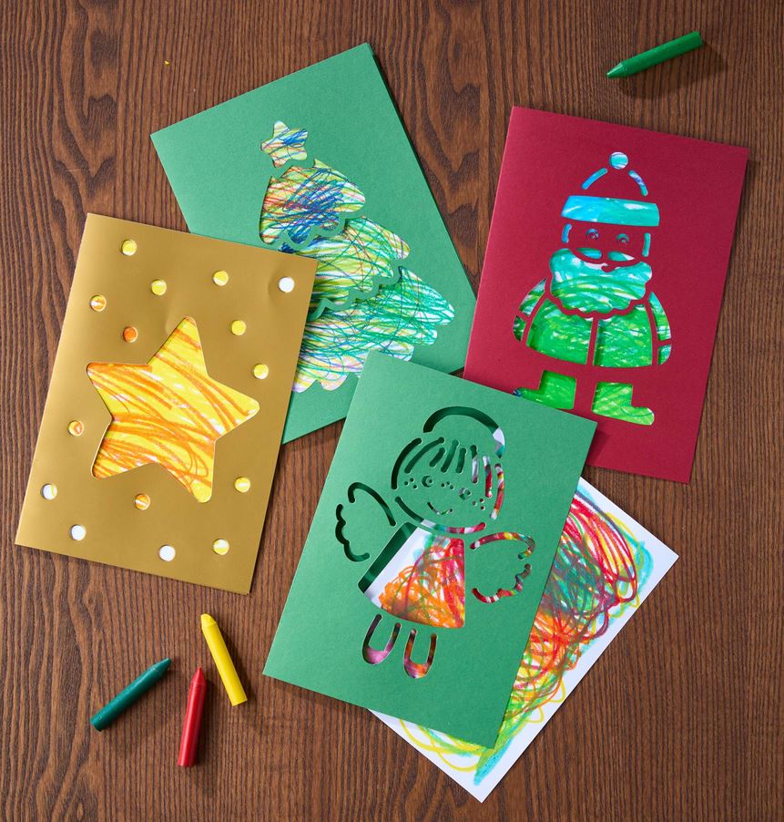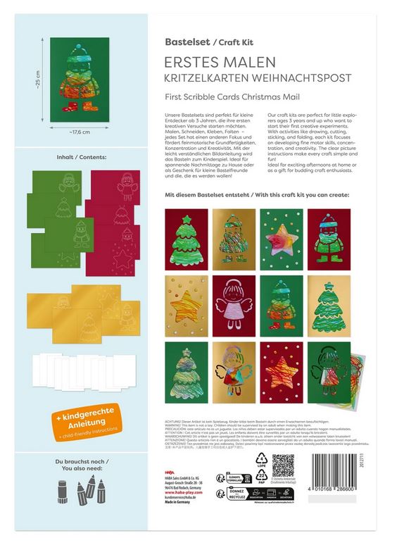 Mit dem Bastelset Erstes Malen Kritzelkarten Weihnachtspost von Haba können Kinder ab drei Jahren schöne und überraschende Weihnachtskarten erstellen: Sie malen entweder ganz wild und impulsiv oder filigran und detailliert die Farb-Hintergründe, die dann hinter die Schablonenkarten geklebt werden. Hier entsteht coole und einzigartige Weihnachts-Kunst!