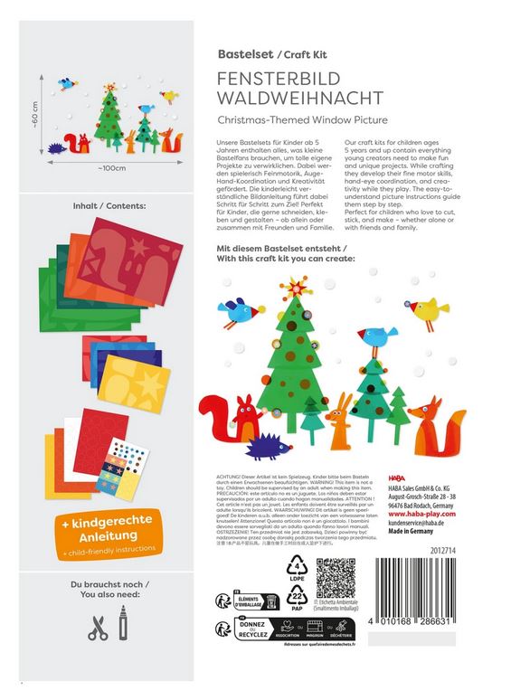 Fenster sind nicht nur zum Durchschauen da: Das Sachenmacher Fensterbild Winterwald Bastelset Weihnachten von Haba verschönert den Ausblick und zaubert Winter-Wunderwald-Stimmung in jede Wohnung. Kinder ab fünf schneiden hier Waldtiere und Tannenbäume aus farbig-transparenter Folie aus und kleben diese dann ans Fenster. Die Folie ist selbstklebend und kann immer wieder verwendet werden, jedes Jahr aufs Neue! Eine schöne Bastel- und Dekobeschäftigung für lange Winterabende!
