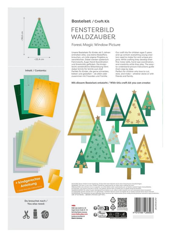 10 Bäume für´s Winter-Fenster: Das Sachenmacher Fensterbild Wald Bastelset Weihnachten von Haba ist eine beschauliche Winterabend-Bastelei, voll stiller, verträumter Winter-Kreativität. Die 10 vorgestanzten Papp-Baum-Teile werden aus den Bögen getrennt, liebevoll verziert und anschließend am Fenster angebracht. Nun wird es warm in den Herzen!