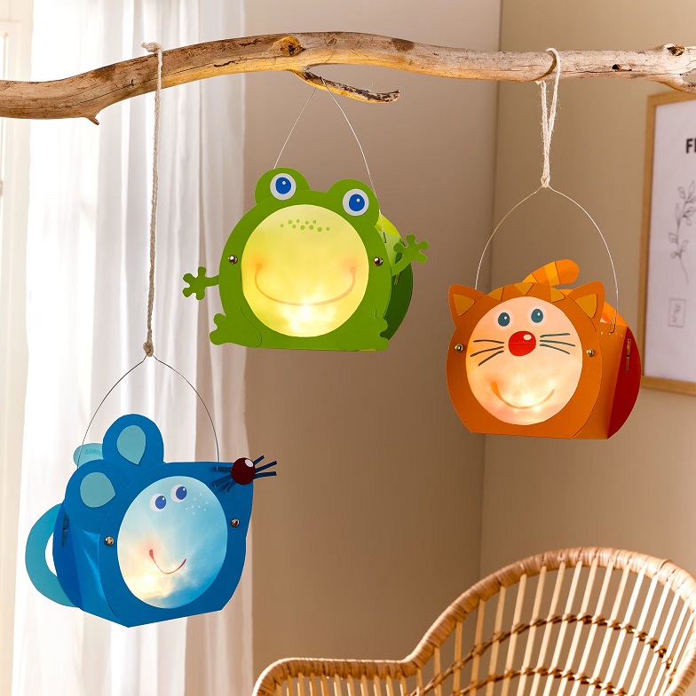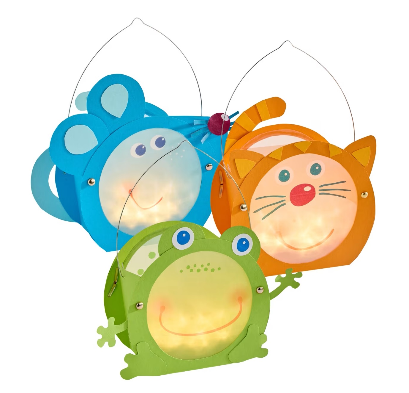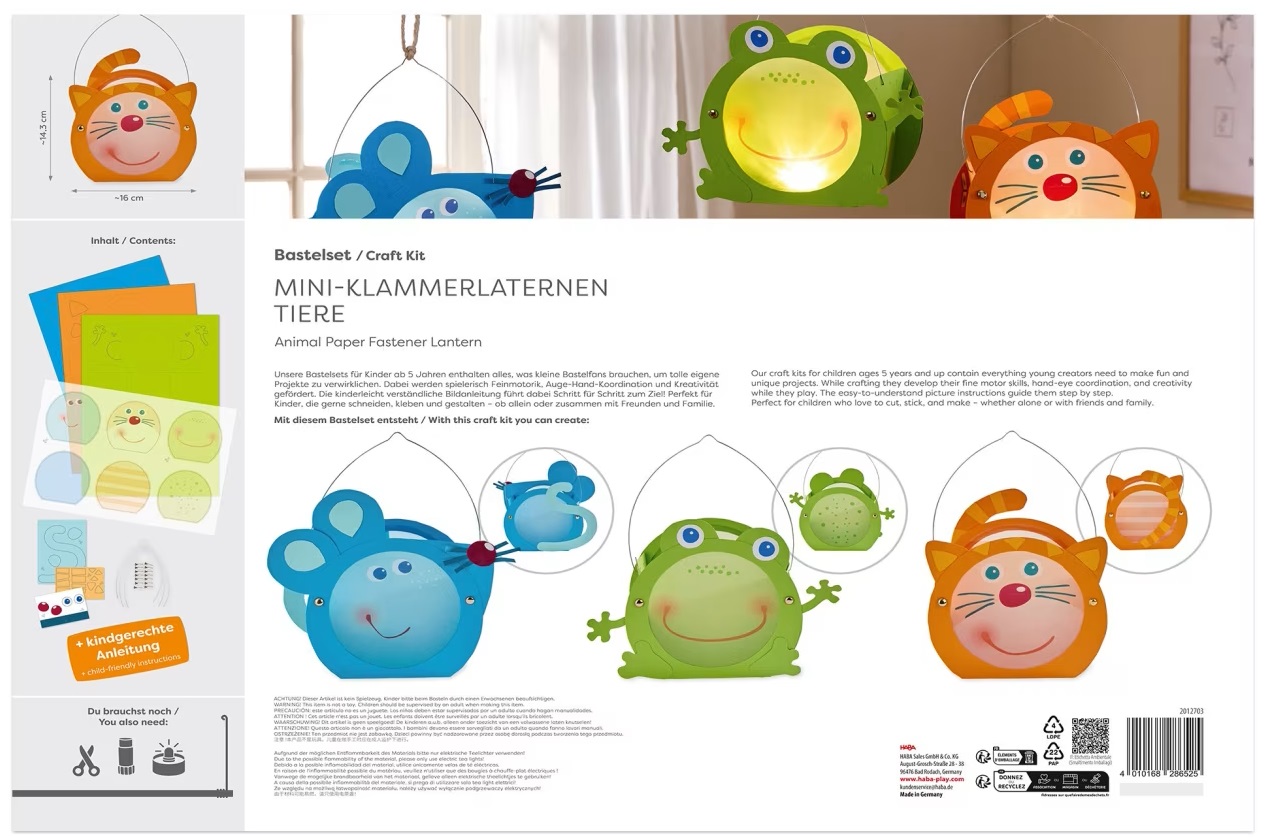 Mit dem Sachenmacher Bastelset Tiere von Haba bastelt ihr drei kleine richtig süße Laternen einfach selbst! Eine Katze, ein Frosch und eine Maus.