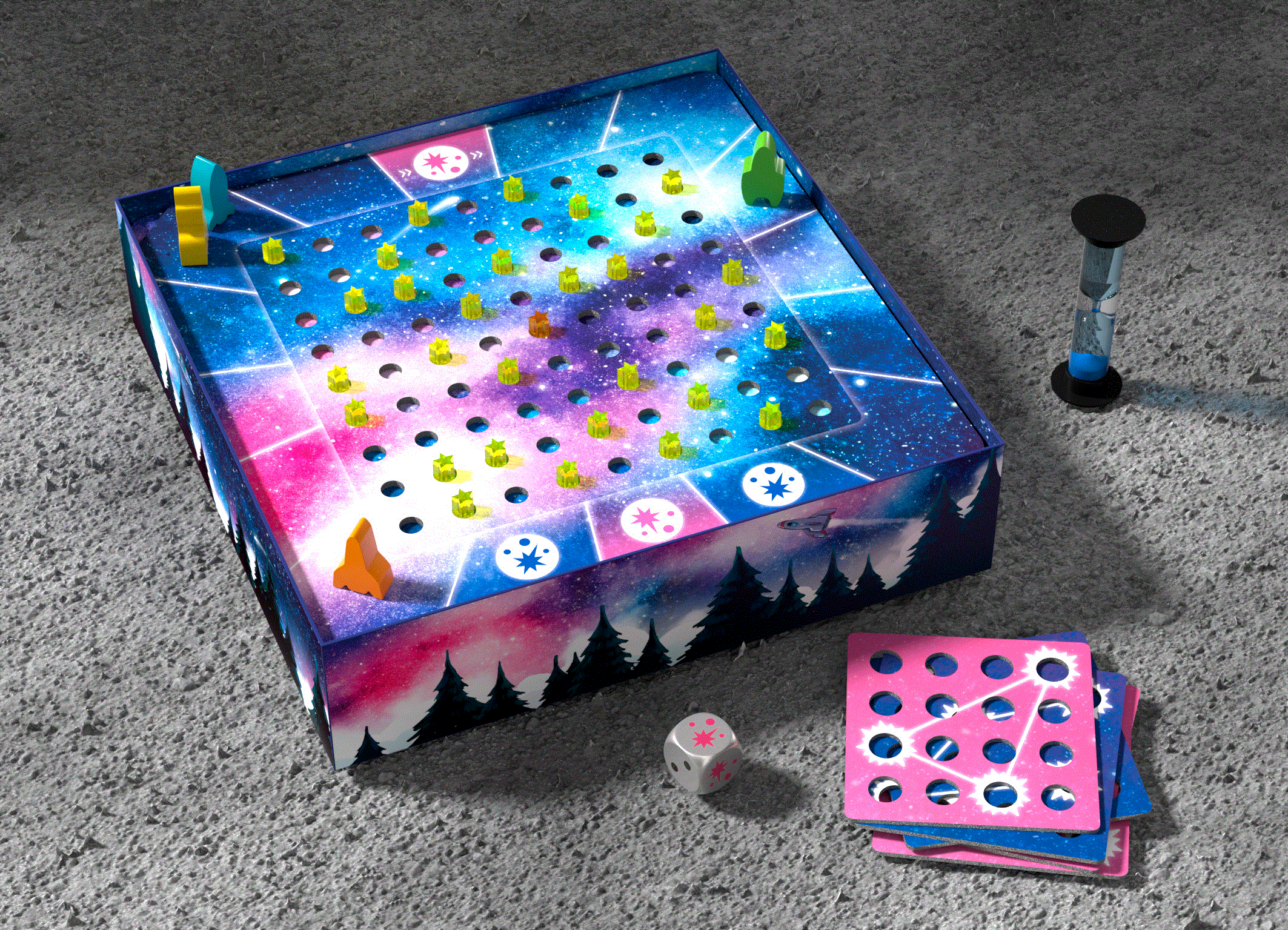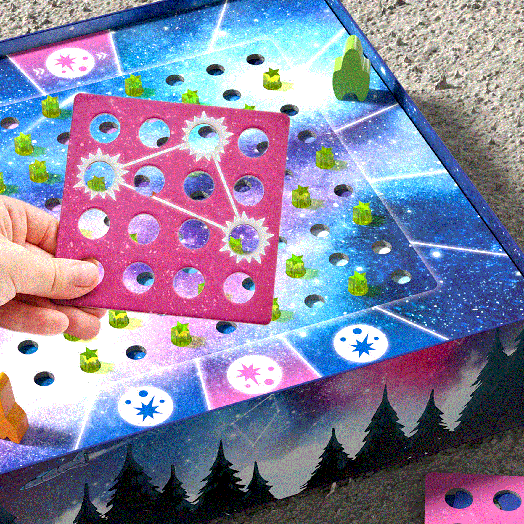 Auf dem schönen Spielfeld von Sternensucher ist eine Galaxie mit Sternensteckern zu sehen. Die Spieler versuchen mit ihren Raketen das Spielfeld 2x zu umrunden. Es wird gewürfel oder nach passenden Sternen für die Sternbildkarte gesucht.