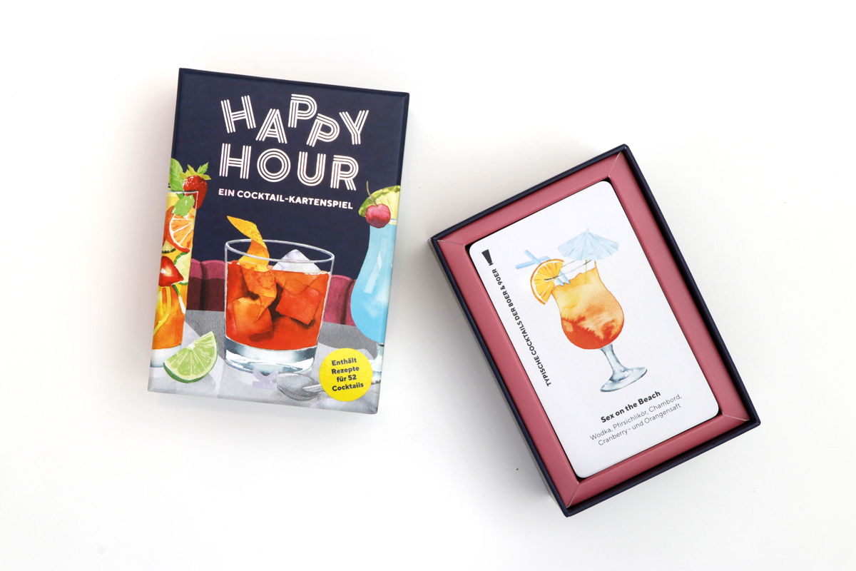 Das Happy Hour Kartenspiel ist ein feuchtfröhlicher Spaß für alle Party- und Cocktail-Fans. Gleich 52 bekannte Cocktails sind dabei, die in passenden 4er Sets zusammengestellt werden müssen. Ein echt lustiger Spiele-Kracher – vielleicht darf es ein Caipirinha oder Mojito dazu sein?