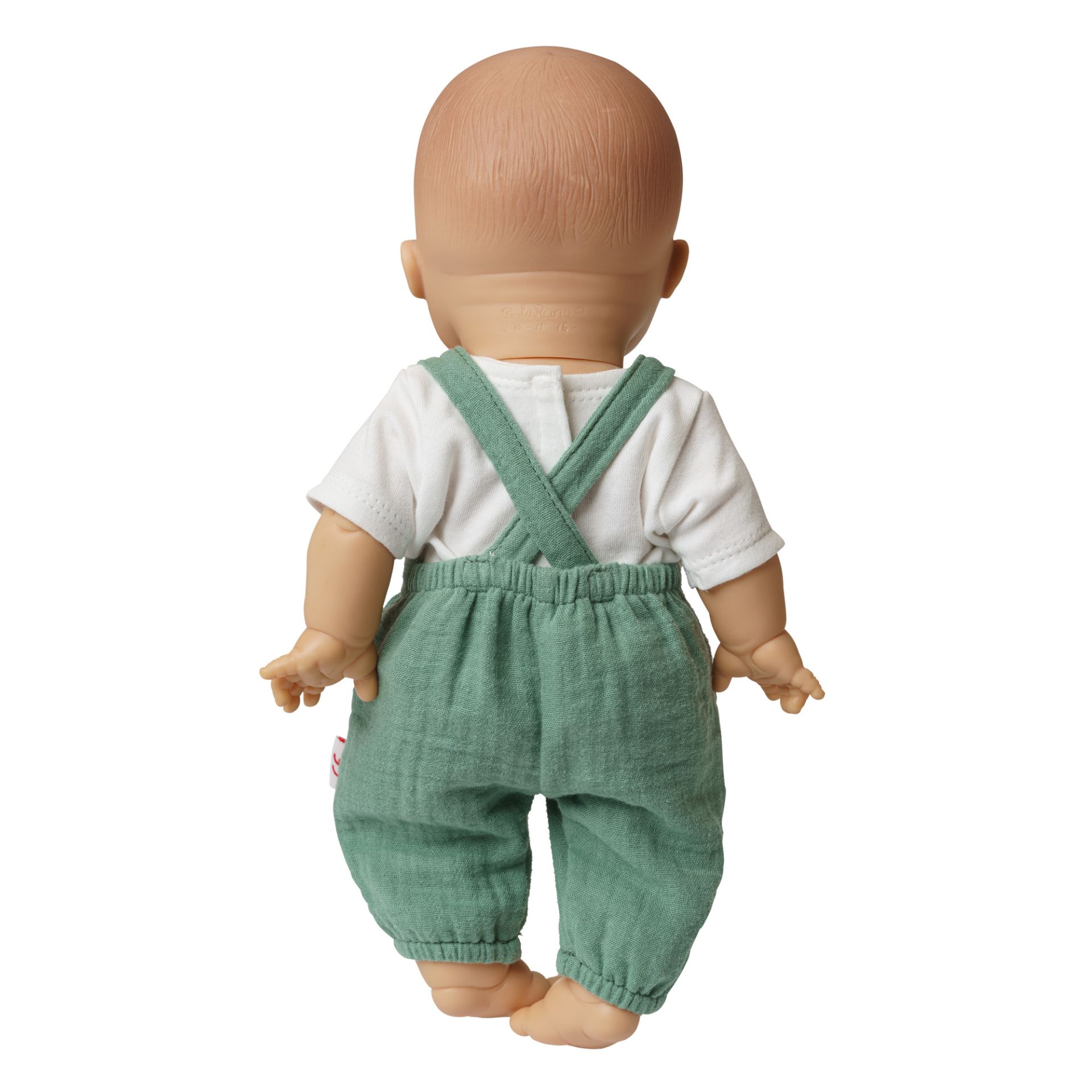 Grüne Musselin-Latzhose und T-Shirt für Puppen von 28-35cm aus Bio-Baumwolle.