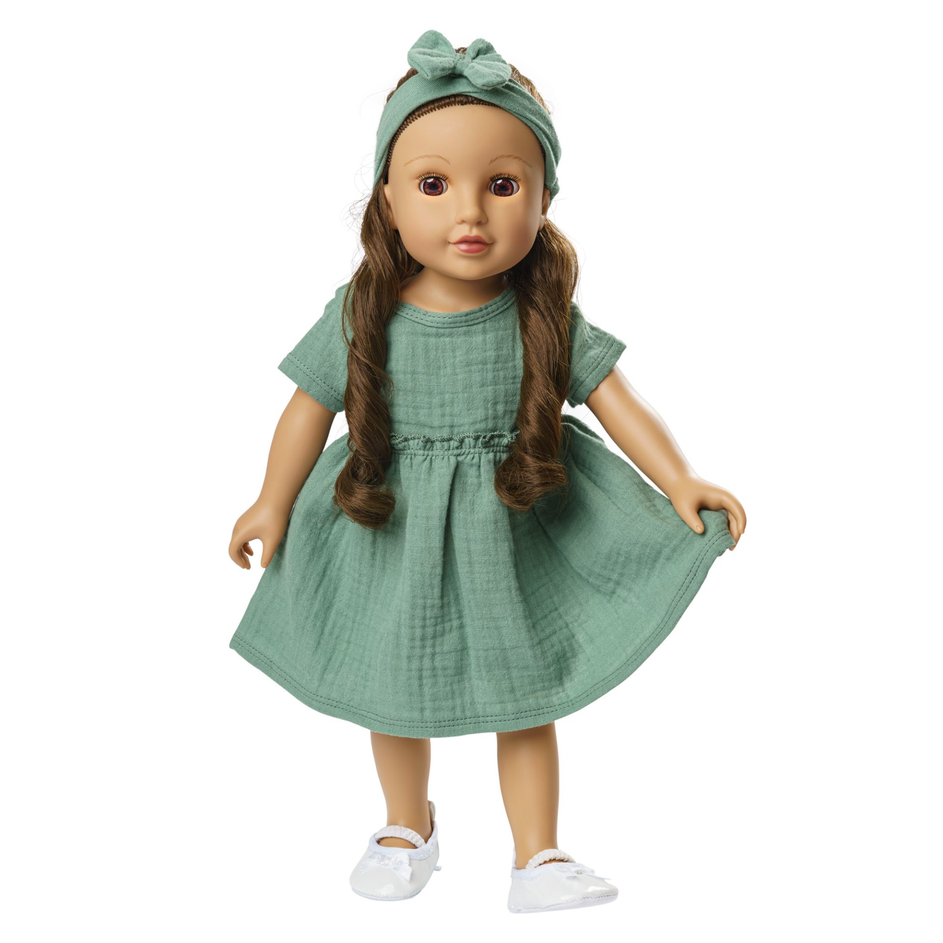 Musselin-Kleid und Haarband für Puppen von 35-45cm aus Bio-Baumwolle.