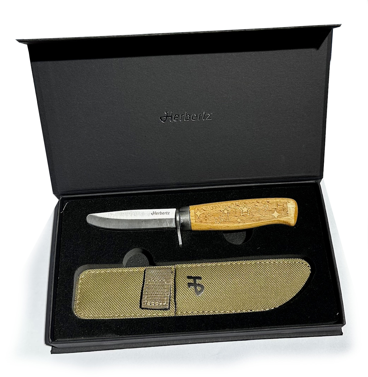 Ein sehr solides feststehendes Kindermesser von Herbertz mit schickem eingefrästem Sternenmotiv auf dem Griff. Als Fahrtenmesser oder Schnitzmesser super. Das Messer kann gleich mit auf Abenteuerexpedition gehen kann, denn die coole Scheide mit Gürtelschlaufe in Olivgrün ist inclusive.