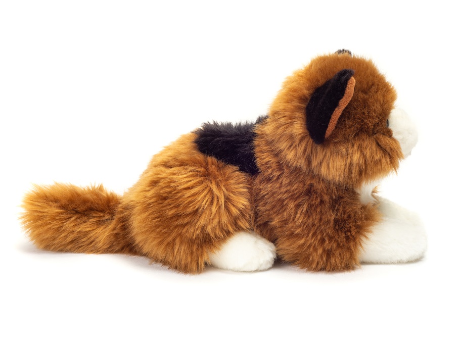 Diese hübsche Glückskatze aus der Hermann Teddy Collection hat eine liegende Position. Sie hat überwiegend weißes Fell, aber eben auch schwarze und goldbraune Flecken.
