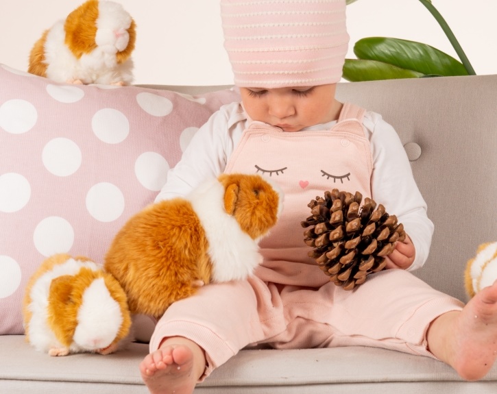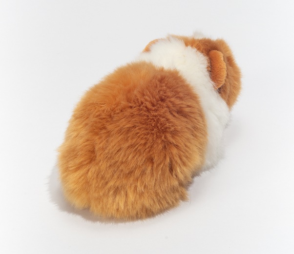 Ein süßes Meerschweinchen Kuscheltier aus der Hermann Teddy Collection mit weißem und goldbraunem Fell. Das flauschige kleine Tierchen ist fast wie ein echtes Haustier. Einfach süß mit den Knopfaugen und dem bunten Fell.